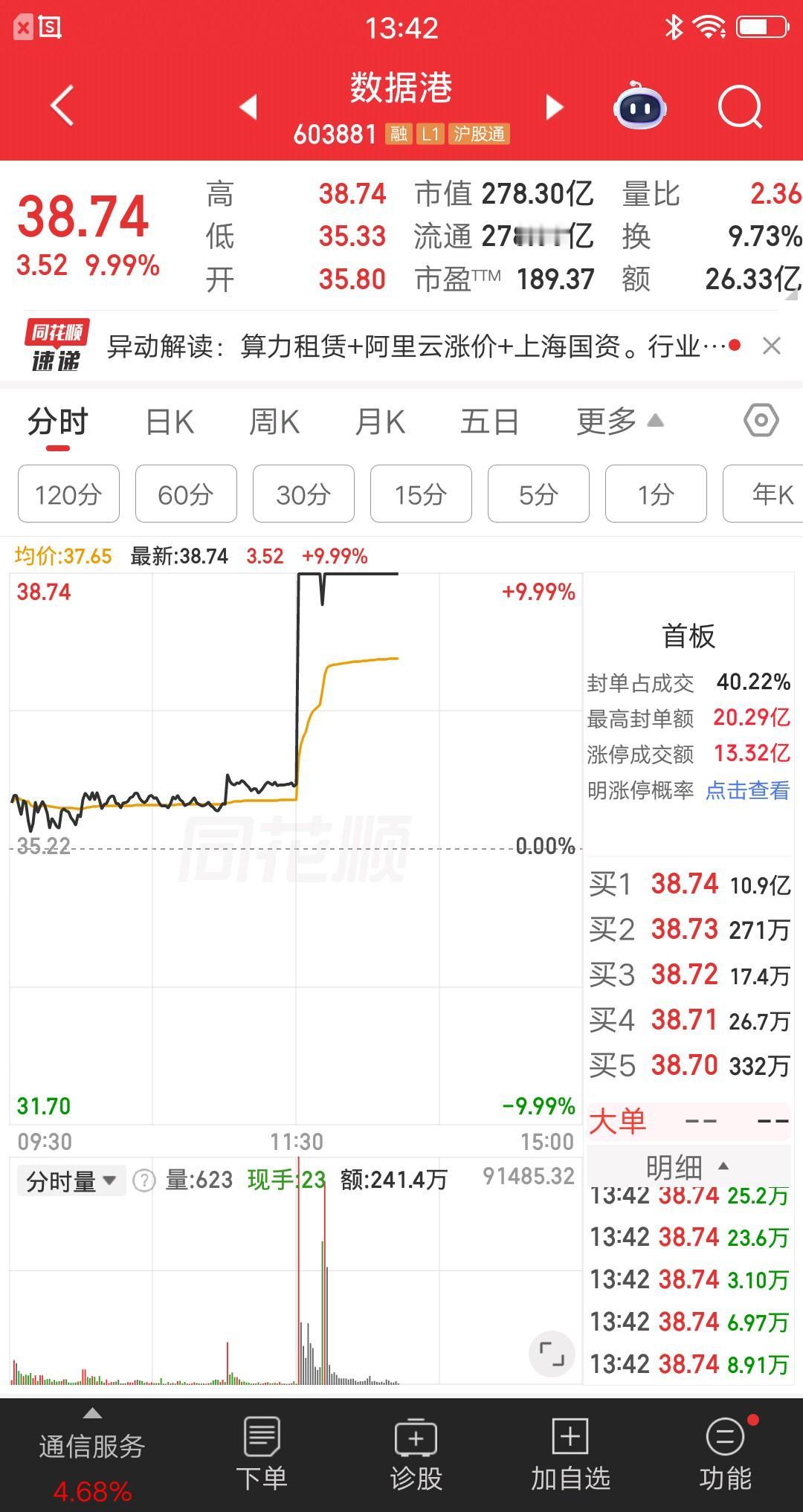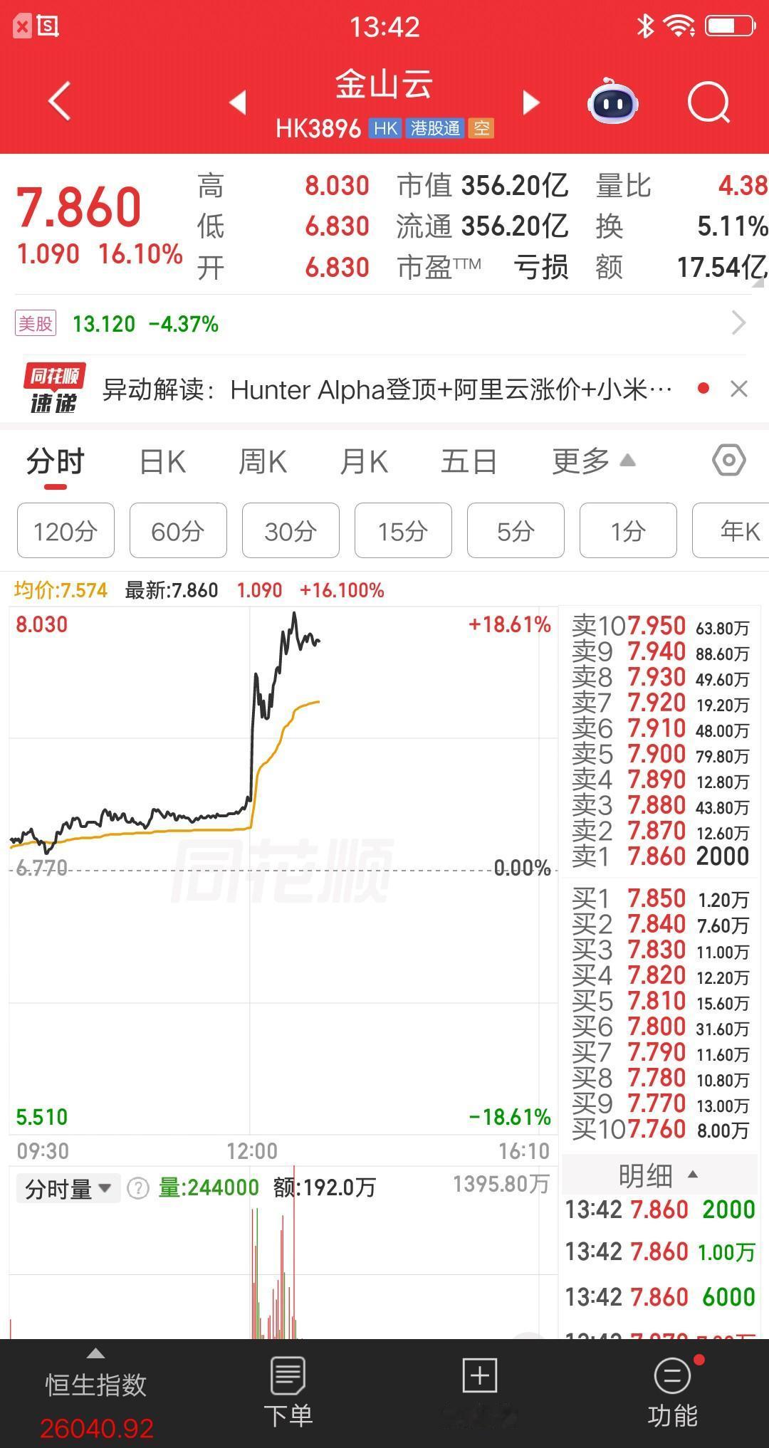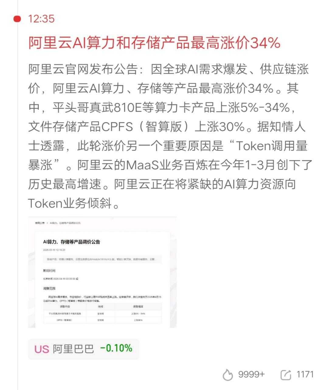 阿里港股午后开盘直线拉升,第一波拉升涨幅2.8%,震荡休整之后。第二波拉升涨到了4%。大家可别小看这点涨幅,对于2.6万亿市值来说很厉害了。 消息面上,午间休市阿里宣布,阿里云AI算力和存储产品最高涨价34%。另外阿里将算力资源,转向Token业务。 受到阿里大涨的带动,港股云计算持续拉升,金山云涨超16%。A股的算力租赁走高,数据港秒板。 这就是带头大哥的实力,一呼百应呀。