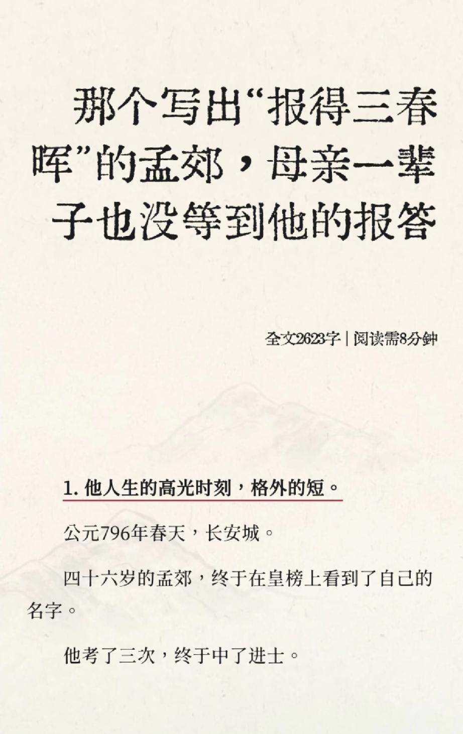 这话说得扎心,却也真实——我们这代人,好像永远在离开和归来之间挣扎。 董宇辉讲过自己的故事。他从陕西潼关的农村走出来,小时候最大的愿望就是离开那片黄土。后来他真的考上了大学,去了大城市,再后来,他站在北京的写字楼里,望着窗外万家灯火,脑子里想的却是老家院子里那棵柿子树。 他说:“我们拼了命地往外跑,不是为了逃离,而是为了有一天能体面地回来。” 这让我想起项羽。他攻入咸阳后,有人劝他定都关中,成就霸业。项羽却望着那滚滚东流的江水,说了一句流传千古的话:“富贵不归故乡,如衣绣夜行,谁知之者?”是啊,他带着八千江东子弟渡江西征,心里装着的,始终是那个可以让他锦衣还乡的故乡。 可项羽最终没能回去。他在乌江边自刎时,说:“无颜见江东父老。” 更让我动容的是唐代诗人孟郊。他一生困顿,46岁才考中进士,骑着快马在长安城里狂奔,写下“春风得意马蹄疾,一日看尽长安花”。可这个得意的进士,后来最打动我们的诗却是那首《游子吟》:“慈母手中线,游子身上衣。”你看,走得多远,心里那根线,始终攥在母亲手里。 就像董宇辉说的:“故乡容不下肉身,他乡容不下灵魂。”这大概就是我们这代人的宿命——永远在路上,永远在回家。