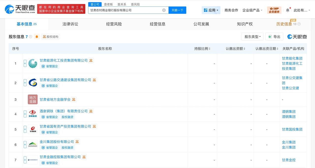甘肃农村商业银行正式登记成立 注册资本约449.2亿 天眼查工商信息显示,近日,甘肃农村商业银行股份有限公司成立,法定代表人为王文永,注册资本约449.2亿人民币,经营范围为银行业务。股东信息显示,该公司由甘肃省国有资产投资集团有限公司、甘肃能源化工投资集团有限公司、甘肃省公路交通建设集团有限公司、酒泉钢铁(集团)有限责任公司等共同持股。 据媒体报道,国家金融监督管理总局近期批复显示,已于2月9日同意筹建甘肃农村商业银行,该行成为2026年全国首家获批的省级统一法人农商银行。 天眼查信息: