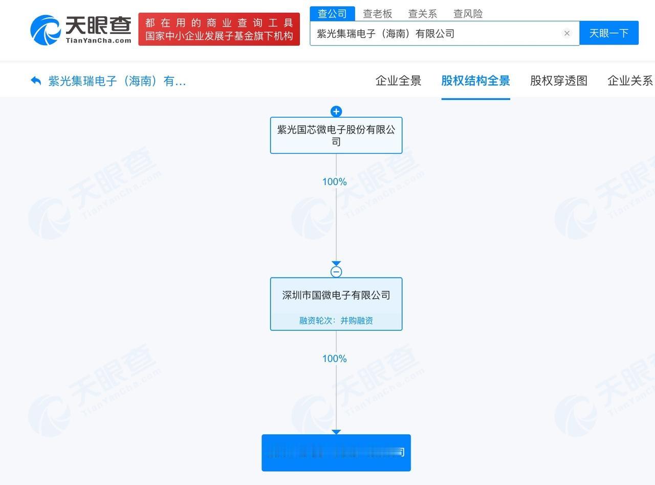 紫光国微在海南成立新电子公司 注册资本5000万 天眼查工商信息显示,近日,紫光集瑞电子(海南)有限公司成立,法定代表人为李天池,注册资本5000万人民币,经营范围包括集成电路设计、集成电路制造、集成电路销售、集成电路芯片设计及服务、电子专用材料制造、软件开发等。股权全景穿透图显示,该公司由深圳市国微电子有限公司全资持股,后者为紫光国微(002049)全资子公司。 天眼查信息: