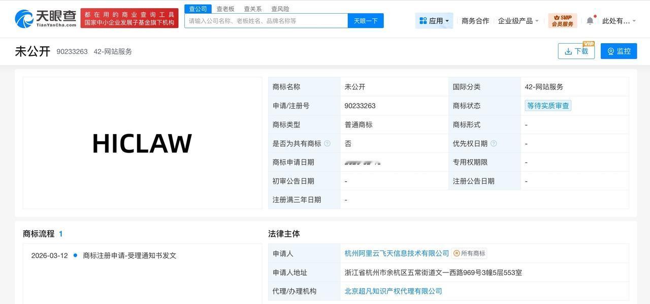 阿里云申请注册HiClaw商标 天眼查知识产权信息显示,近日,杭州阿里云飞天信息技术有限公司申请注册两枚“HICLAW”商标,国际分类为网站服务、科学仪器,当前商标状态为等待实质审查。 杭州阿里云飞天信息技术有限公司成立于2019年3月,法定代表人为蒋江伟,注册资本约103万人民币,经营范围含经营电信业务,计算机软硬件、电子产品、数码产品的技术开发、技术服务,企业管理咨询与计算机信息技术咨询等。股东信息显示,该公司由浙江阿里巴巴云计算有限公司全资持股。 公开信息显示,HiClaw是由阿里云于3月正式开源的多智能体协作系统,支持多个AI Agent协同完成复杂任务。 天眼查信息: