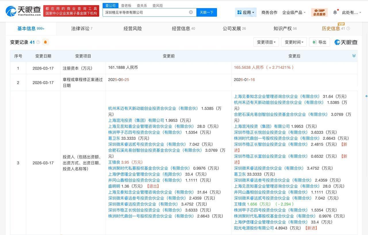 阳光电源等入股格见半导体 后者为芯片设计企业 天眼查工商信息显示,近日,深圳格见半导体有限公司发生工商变更,新增阳光电源(300274)、深圳市稳正长智创业投资企业(有限合伙)、深圳市稳正长富创业投资企业(有限合伙)为股东,同时注册资本由约161.19万人民币增至约165.56万人民币。 深圳格见半导体有限公司成立于2022年4月,法定代表人为陈文斌,经营范围含集成电路设计、集成电路芯片设计及服务、软件开发、智能控制系统集成等。股东信息显示,该公司由上海伊偲瑾企业管理合伙企业(有限合伙)、葛卫东、上海见秦知念企业管理咨询合伙企业(有限合伙)及上述新增股东等共同持股。 公开信息显示,格见半导体专注于高端实时控制DSP芯片设计,涵盖数字能源、数字电源、工业自动化、智能汽车、机器人、高端家电和电网轨交等领域。 天眼查信息: