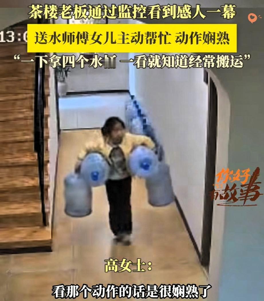 谁说现在的孩子只懂玩手机? 安徽茶楼监控里的这一幕,看得人心里暖烘烘的! 送水师傅8岁的女儿,每次跟着爸爸来店里,都会麻利地帮着搬空水桶。 胳膊夹一个,双手各提一个,短短几秒就搞定四个空桶,动作熟练得让人心疼。 店员说这孩子特别有规律,工作日下午放学就来,周末一早跟着出勤,从没喊过累。 这哪是帮忙,分明是替爸爸分担的小棉袄。 很多人说现在的孩子娇生惯养,可这个小姑娘用行动证明,懂事和年龄无关,和家境无关,只和骨子里的教养有关。 这种从小就懂得体谅父母的孩子,未来一定差不了。 你身边有没有这样懂事的小大人?快来评论区分享一下吧!
