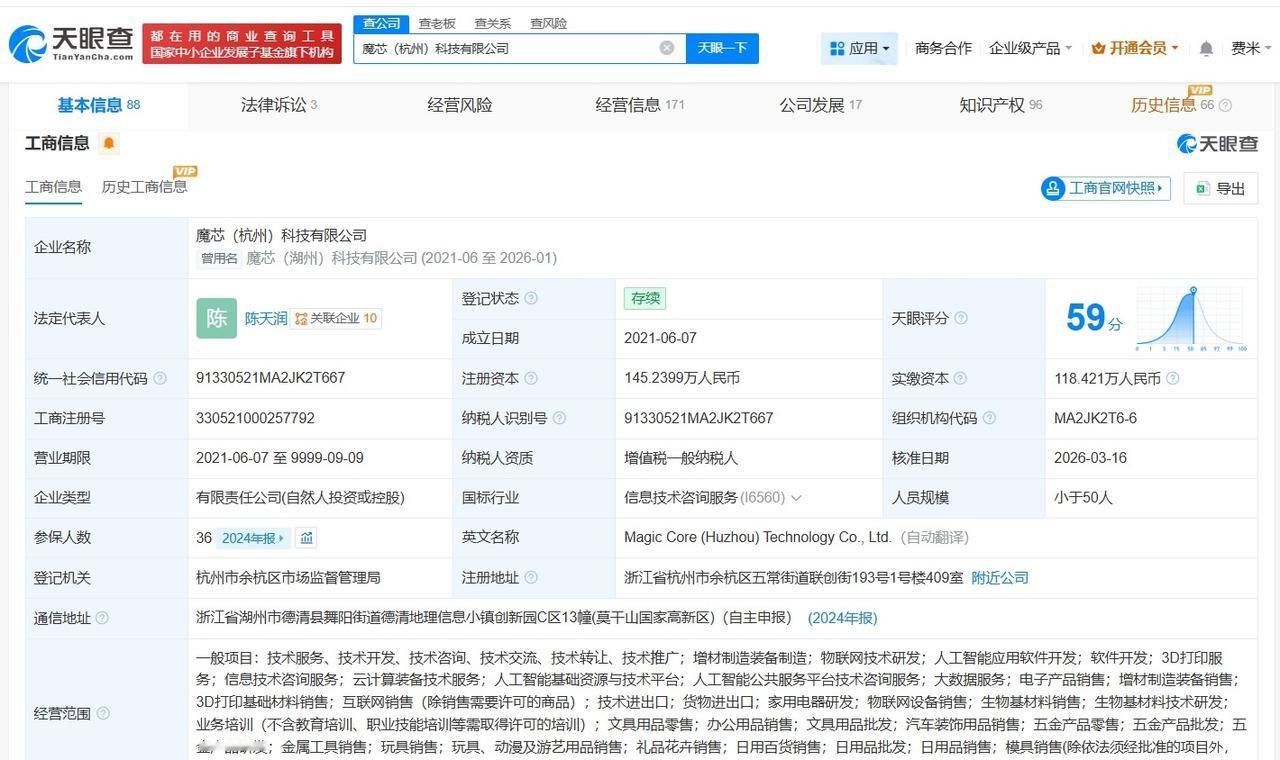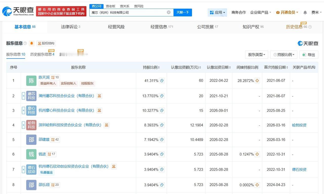 华为哈勃等入股AI应用研发商魔芯科技 天眼查工商信息显示,近日,魔芯(杭州)科技有限公司发生工商变更,新增华为旗下深圳哈勃科技投资合伙企业(有限合伙)、邵建雄为股东,同时,注册资本由约118万人民币增至约145万人民币,多位主要人员发生变更。 魔芯(杭州)科技有限公司成立于2021年6月,法定代表人为陈天润,经营范围含增材制造装备制造、人工智能应用软件开发、3D打印服务等。股东信息显示,该公司现由陈天润、湖州蘑芯科技合伙企业(有限合伙)及上述新增股东等共同持股。公开资料显示,该公司主营消费级3D打印机的研发、生产与销售,核心品牌为“KOKONI”。 天眼查信息: