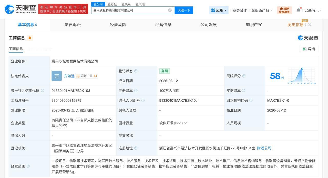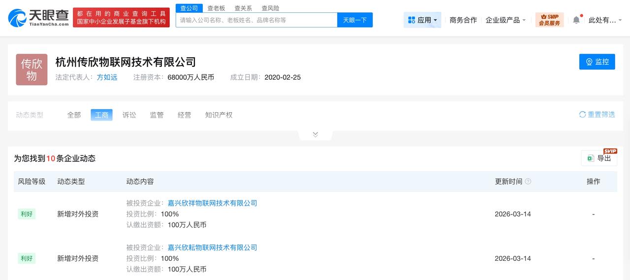 菜鸟网络同日成立2家物联网技术公司 天眼查工商信息显示,近日,嘉兴欣祥物联网技术有限公司、嘉兴欣耘物联网技术有限公司成立,法定代表人均为方如远,注册资本均为100万人民币,经营范围包括物联网技术研发、物联网技术服务、信息技术咨询服务、物联网设备销售、普通货物仓储服务、智能仓储装备销售等。股东信息显示,上述2家公司均由菜鸟网络旗下杭州传欣物联网技术有限公司全资持股。 天眼查信息: