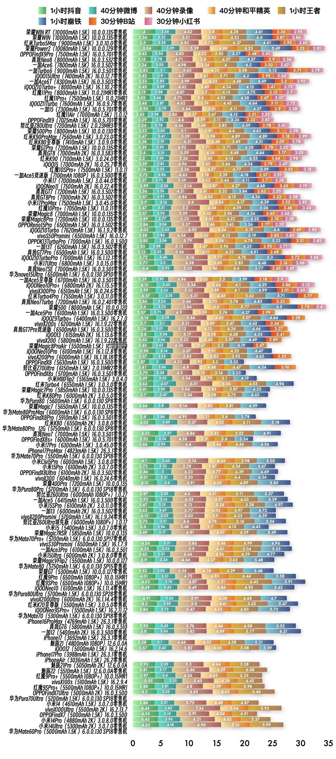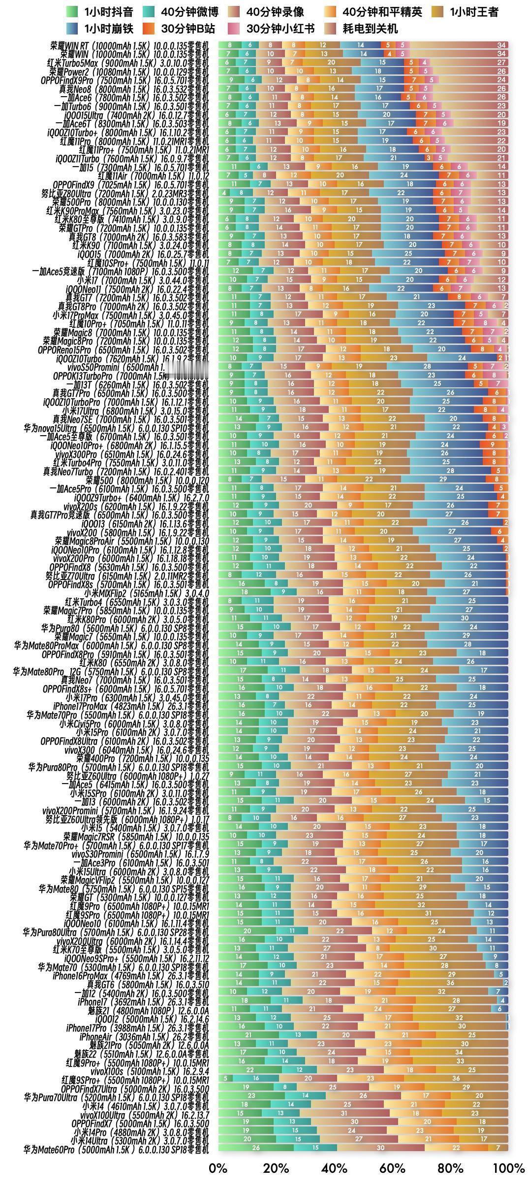 『3月18日最新手机续航榜单』 新评科技续航排行榜 6.0标准续航排行榜复测14台手机续航成绩 ⭐️完整详细榜单请访问新评科技数据库小程序⭐️ ① 荣耀WIN RT零售机 第6次复测 10.0.0.135版本续航时间缩短6分钟,总续航时间8小时34分钟,最新排名第1名【对比历史成绩续航缩短】 ② 荣耀WIN零售机 第6次复测 10.0.0.135版本续航时间缩短7分钟,总续航时间8小时31分钟,最新排名第2名【对比历史成绩续航不变】 ③ OPPOFindX9Pro零售机 第6次复测 16.0.5.701版本续航时间增加26分钟,总续航时间7小时47分钟,最新排名第5名【对比历史成绩续航不变】 ④ iQOO15Ultra零售机 第4次复测 16.0.12.7版本续航时间增加27分钟,总续航时间7小时19分钟,最新排名第9名【对比历史成绩续航不变】 ⑤ 一加15零售机 第6次复测 16.0.5.701版本续航时间增加1分钟,总续航时间6小时54分钟,最新排名第15名【对比历史成绩续航不变】 ⑥ OPPOFindX9零售机 第6次复测 16.0.5.701版本续航时间缩短11分钟,总续航时间6小时49分钟,最新排名第17名【对比历史成绩续航缩短】 ⑦ 努比亚Z70Ultra零售机 第4次复测 2.0.11MR2版本续航时间增加21分钟,总续航时间5小时11分钟,最新排名第62名【对比历史成绩续航增加】 ⑧ 荣耀Magic7Pro零售机 第4次复测 10.0.0.135版本续航时间增加5分钟,总续航5小时整,最新排名并列第65名【对比历史成绩续航不变】 ⑨ 荣耀Magic7零售机 第4次复测 10.0.0.135版本续航时间增加4分钟,总续航时间4小时59分钟,最新排名并列第67名【对比历史成绩续航不变】 ⑩ OPPOFindX8s+零售机 第3次复测 16.0.5.701版本续航时间增加2分钟,总续航时间4小时53分钟,最新排名第75名【对比历史成绩续航不变】 11 荣耀400Pro 第4次复测 10.0.0.135版本续航时间缩短6分钟,总续航时间4小时43分钟,最新排名并列第83名【对比历史成绩续航缩短】 12 华为Pura80Pro零售机 第5次复测 6.0.0.130 SP18版本续航时间缩短3分钟,总续航时间4小时43分钟,最新排名并列第83名【对比历史成绩续航不变】 13 iPhone17零售机 第6次复测 26.3.1版本续航时间缩短4分钟,总续航时间4小时08分钟,最新排名第111名【对比历史成绩续航缩短】 14 iPhone17Pro零售机 第6次复测 26.3.1版本续航时间增加9分钟,总续航时间4小时03分钟,最新排名并列第113名【对比历史成绩续航缩短】 新评科技有6.0标准续航排行榜,6.0折叠屏续航排行榜,均可以查看每款手机每个环节功耗,5.1长续航版(低压力版)排行榜,所有排行榜共计209台手机中,有118台是零售机,从24年1月到26年3月,我们已经花费85.8万元人民币购买零售机。 新评科技续航排行榜,是全行业零售机最多、复测系统版本最新的续航排行榜,并且公布全程测试录像。