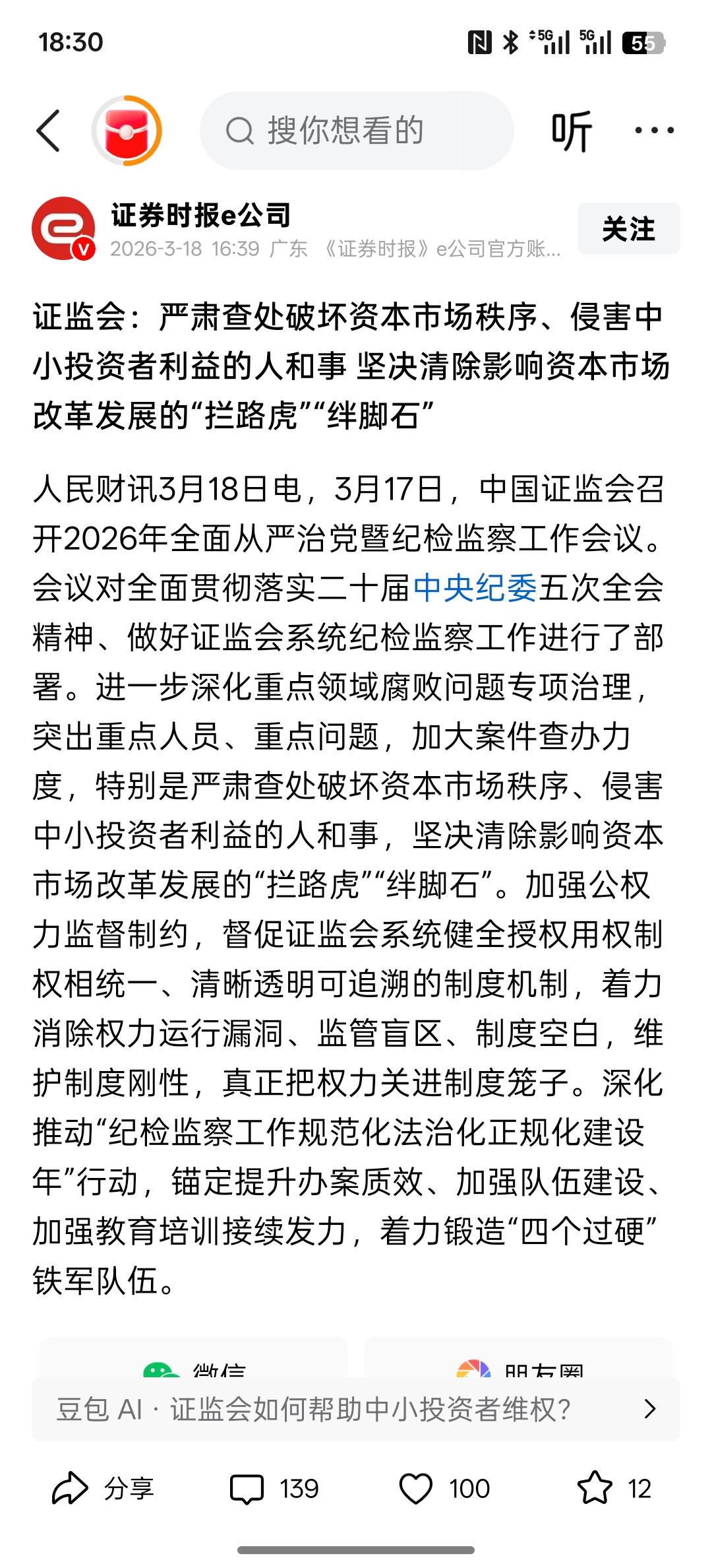 中国股市必须得涨啊。“投资者保护”首次写入十五五,证监会火速部署:坚决清除“拦路虎”与“绊脚石”,这一次真的是对金融资本市场改革是下定了重大的决心,而且对于资本市场的绊脚石是要间接的清除,谁都阻挡不了中国金融资本市场持续发展!金融强国必然会大力改革金融资本市场,在制度方面肯定会更加完善!金融资本上的权利肯定会用制度来管制!在金融资本市场出现的犯罪,比如欺诈发行,财务造假,可能会动用刑事案件!因为对于现在的金融资本市场必然会越来越严格!不是谁想钻漏洞,钻空子,谁想利用空白的制度漏洞来为自己谋利,甚至违法犯罪,未来都将会变成严打对象! 中国的金融资本市场会越来越好,将会越来越规范,越来越透明化! 保护中小投资者的利益就是维护金融资本市场健康发展,金融资本市场是由中小投资者组合在一起的!中小投资者的投资金融资本市场才是大势所趋,只靠少数大资金怎么可能健康发展?中小投资者也是金融资本市场建设的重要力量,不容疏忽!保护中小投资者利益是迫在眉睫!