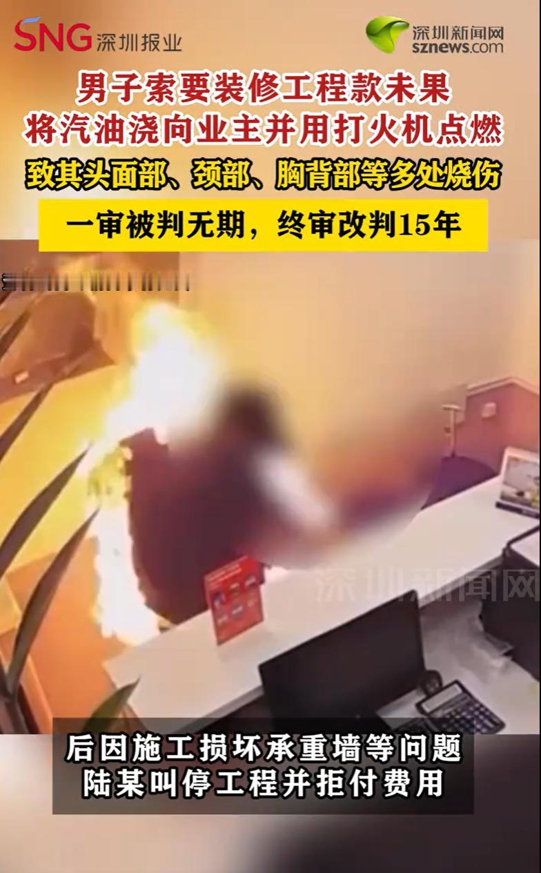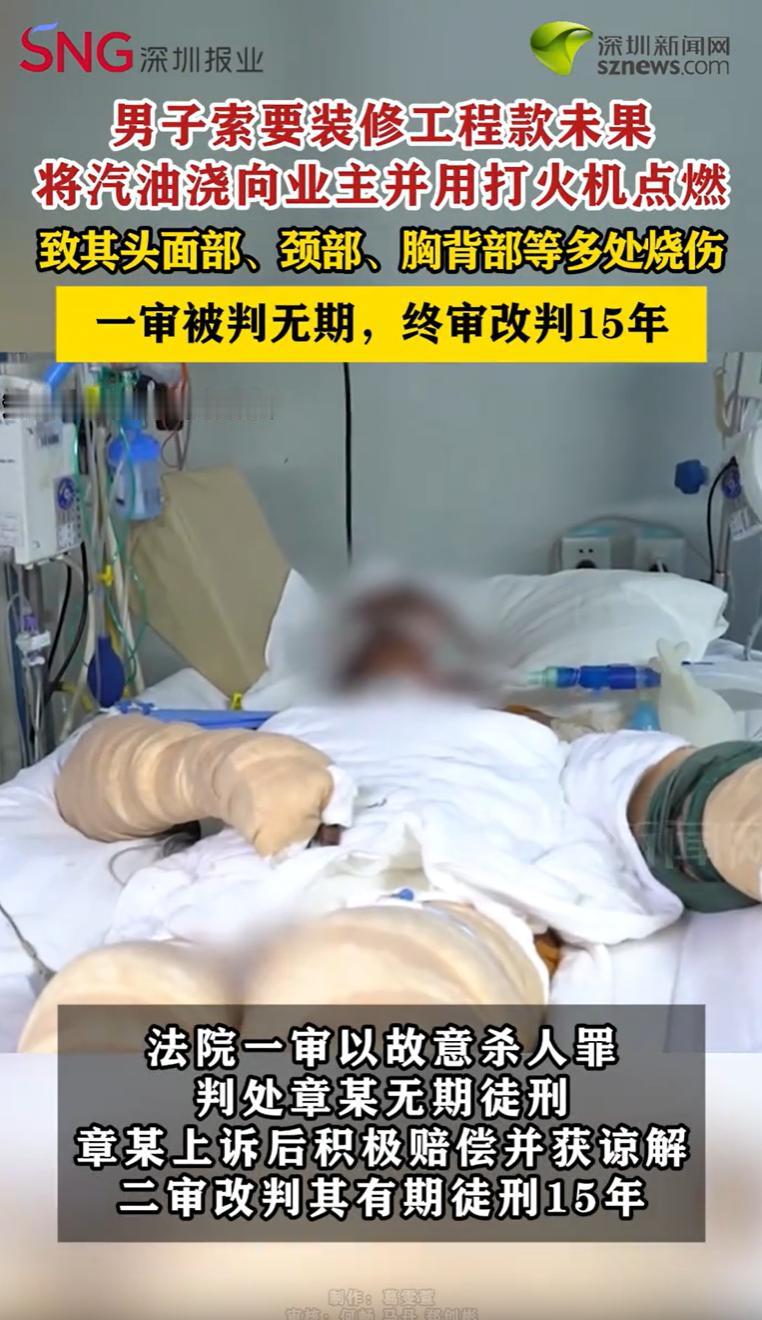 内蒙古,一男子想把家里墙拆了,把家门钥匙交给装修师傅,活儿怎么干、多少钱,全是口头一说,没签合同。师傅抡锤进场,刚干一半,男子来了一看,地板没做保护砸花了,承重墙也拆出问题。当场叫停,让师傅清完垃圾走人,剩下的活儿不给他了。师傅傻眼了,活干了,力出了,钱一分没见着。事后,师傅把费用明细微信发过去,一趟趟找男子要钱。男子心里也有气,地板砸了墙坏了,这账怎么算?拖着,不给说法。后来,师傅又去男子开的牙科诊所要钱,吵了一架被轰出来。师傅没回家,弄了个矿泉水瓶灌满汽油,下午又折返回去,走到男子身边,没吭声,汽油劈头盖脸浇下去,打火机一亮,火光瞬间把两个人吞了。结果,男子全身33.56%烧伤,师傅也烧得不轻,还要面临牢狱之灾。 据悉,老陆是一个在当地开了家口腔诊所的业主,想把自家房子的墙拆一拆,重新规整规整。 2024年4月,他找到了老章,一个靠干零活、接点装修散工养家糊口的汉子。 一个出钱,一个出力,这事儿本就这么简单。 老陆信任地把家门钥匙交给了老章,让他进场施工。 两人都是大老粗,没签合同,没写协议,拆哪堵墙、多少钱、什么时候干完,全是口头一说。 老章带着人抡起大锤干得热火朝天,老陆抽空去现场看了一眼,这一看,火就上来了。 满地都是碎石块,把家里的木地板划得一道一道的,完全没有做任何保护。 更要命的是,老陆请懂行的人一瞧,说老章砸的这墙,好像是承重墙。 这下老陆不敢再让他干了,当场叫停施工,让老章把垃圾清走,后续的工程,他准备另请高明。 活儿干了一半被叫停,干装修的最怕这个。 老章心里也委屈,我这大锤也抡了,力气也出了,你不能让我白干啊。 他把已施工的费用明细,通过微信发给了老陆,前后找了他好几次。 可老陆那边呢,也是一肚子气。你把我地板弄坏了,把承重墙砸了,这损失我找谁要去? 工程款的事,就这么僵住了,谁也没给谁一个准话。 日子一天天过去,拖到了年底。 几百天的焦躁,足以把一个老实人逼到墙角。 2024年12月30日,老章再次走进了老陆的那家口腔诊所。 这已经是第几次来要钱了,他自己都数不清,诊所里那股消毒水味,和牙钻的滋滋声,都让他感到烦躁和窒息。 不出所料,没说两句,两人又吵了起来。 老陆忙着招呼病人,根本没心思跟他掰扯。 老章被轰出了诊所。 被赶出门的老章,心里那团火越烧越旺,冷风一吹,他非但没冷静下来,反而生出一个可怕的念头。 他去买了个矿泉水瓶,把里面的水倒掉,然后在一个地方,灌满了汽油,整整一瓶子。 下午,他带着这个装着汽油的矿泉水瓶,再次返回了诊所。 诊所里,老陆正弯着腰,全神贯注地给躺在牙椅上的病人治疗,他背对着门,毫无防备。 老章推门进去,没有争吵,没有警告,他拧开瓶盖,把那一整瓶汽油,兜头盖脸地朝老陆浇了上去。 还没等老陆反应过来,还没等他看清来的是谁,老章手里的打火机,火光腾地一下炸开。 老陆瞬间变成了一个火人,惨叫着,本能地用双手捂着脸在地上打滚。 老章自己也被飞溅的汽油点着,烧得满地乱跳。 警方和救护车几乎是同时赶到的。 老陆被送进医院时,人已经快不行了,全身烧伤面积达到33.56%,而且是头面部、颈部这些要害部位,构成了重伤二级。 而老章,自己也被烧伤了,被铐在病床上,等待他的,是法律的审判。 法院会如何判决呢? 《刑法》第二百三十二条规定:故意杀人的,处死刑、无期徒刑或者十年以上有期徒刑;情节较轻的,处三年以上十年以下有期徒刑。 法院指出,不同于放火罪,章某的行为具有明确的指向性,他将汽油全部浇在了被害人陆某一人身上,并针对陆某一人点火,而非诊所内的其他病人或公共财产。 法院认为,以故意伤害罪或故意杀人罪(未遂)起诉和审判,更能准确地评价其行为的社会危害性。 进一步而言,章某是将汽油从被害人陆某的头面部浇下,直接致死风险极高。 章某作案时,没有进行任何语言交涉,没有给陆某任何反应和避险的时间,直接实施了泼洒和点燃的行为,至少存在放任对方死亡的故意。 认为,章某主观上具有杀人故意,客观上实施了足以致命的行为,因意志以外的原因未能得逞,故构成故意杀人罪(未遂)。 不过,《刑法》第二十三条规定,对于未遂犯,可以比照既遂犯从轻或者减轻处罚。 且章某及其亲属在二审期间,通过变卖资产、多方筹借等方式,积极对陆某进行了经济赔偿,取得谅解,依法可以从宽处罚。 最终,二审法院改判了一审法院量刑部分,改判被告人章某有期徒刑十五年。 有人说,别把这事儿简单分成谁对谁错。两个都是普通人,都觉得自己委屈,都觉得自己有理,结果呢?一个毁了容,一个进了监狱。谁赢了? 对此,你怎么看?