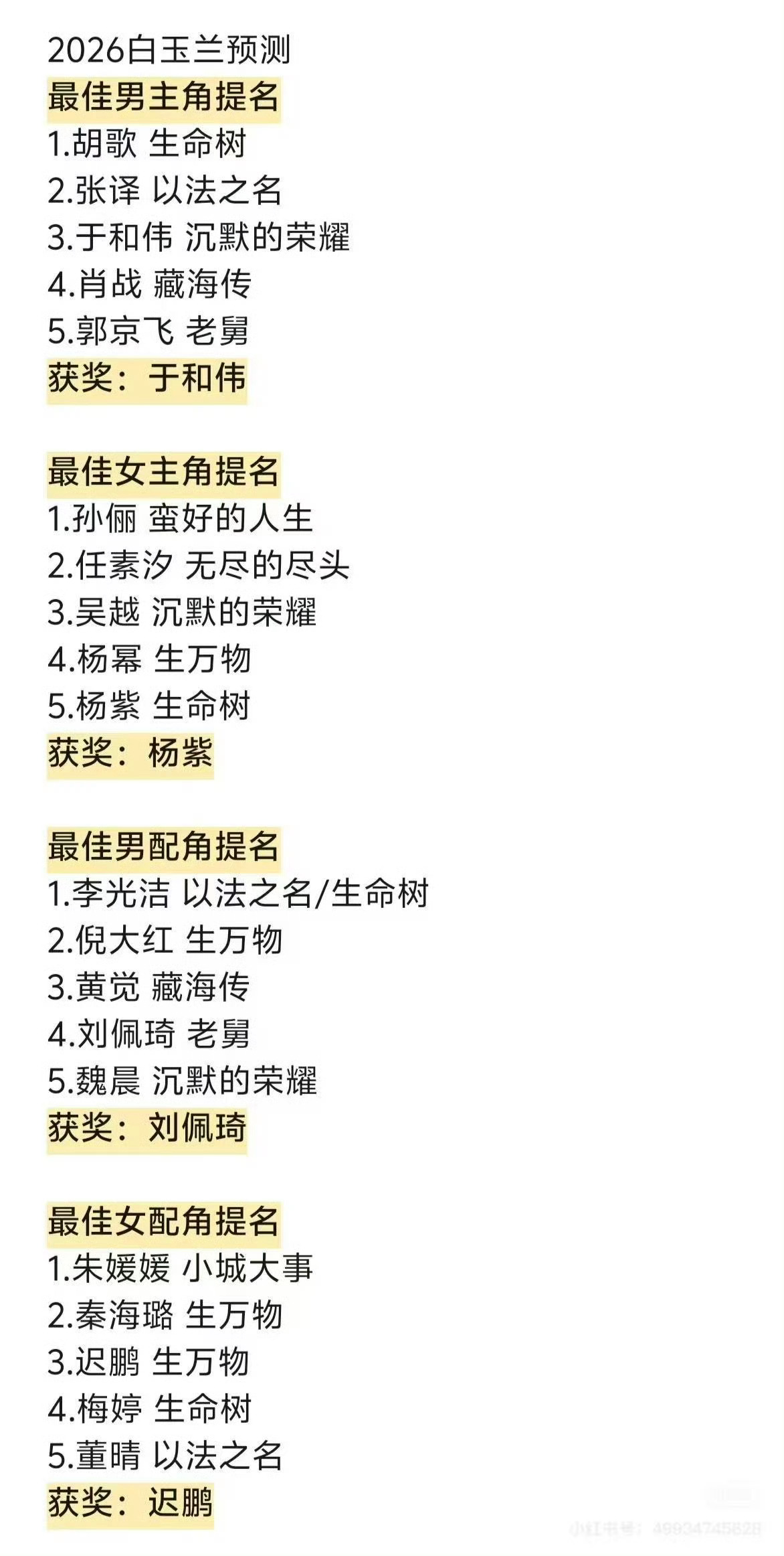 网友的预测,最佳男女主角是于和伟和杨紫!你们觉得谁会拿奖?白玉兰官宣6月26日颁
