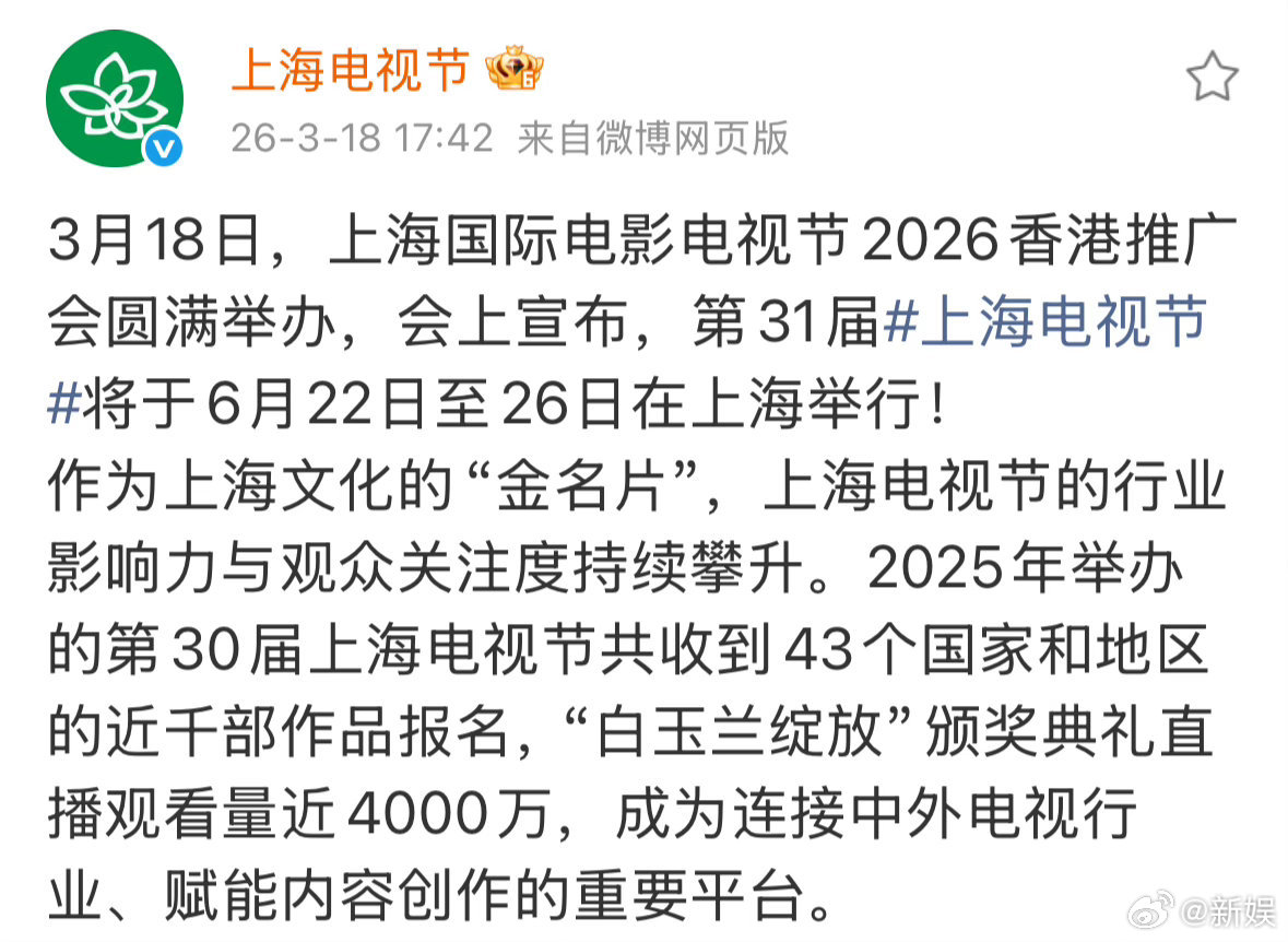 白玉兰官宣6月26日颁奖白玉兰官宣6月26日颁奖!肖战《藏海传》;杨紫、胡歌《生命树》;、赵丽颖、黄晓明《小城大事》;杨幂、欧豪《生万物》;迪丽热巴《利剑玫瑰》、孙俪《蛮好的人生》;于和伟、吴越《沉默的荣耀》;张译、李光洁、蒋欣 《以法之名》;任素汐《无尽的尽头》、梅婷《好好的时代》等,你最期待哪些剧集和演员入围?新娱