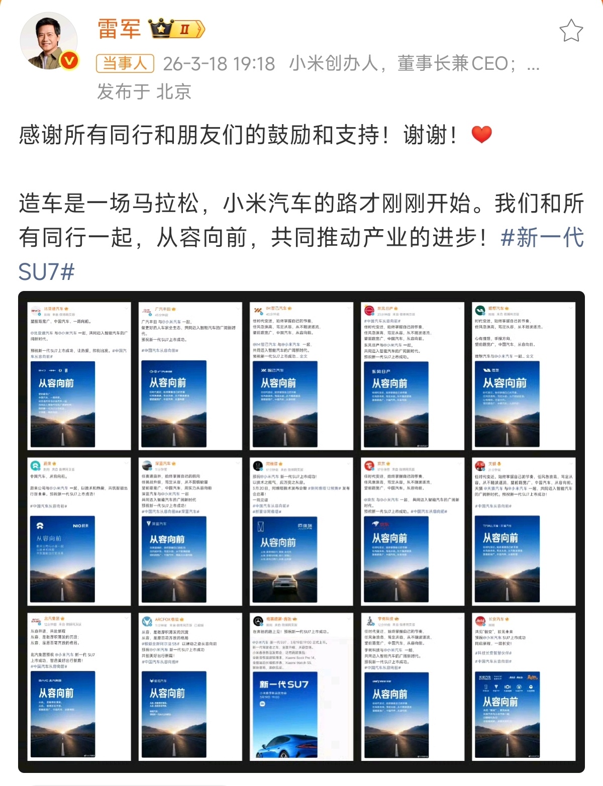 这个时候会有疑问,作为汽车同行,必然会存在竞争,为什么要祝贺小米呢?