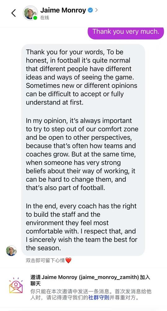 大连英博洋助教直接掀桌子了,公开炮轰:你们想走出舒适区,太难! 这葡萄牙哥们叫Jaime,柏林赫塔来的,欧足联PRO证。人家跟球迷直接挑明了,问题不在于钱,原话是“有的人信念太坚定,想改变他们,难”。你细品。 矛头指谁?有球迷就说,自己发了个视频分析战术,李国旭二话不说就把他拉黑了,俩人还是互关两年的朋友。 请不来先进的理念,留不住敢说真话的人,守着自己的一亩三分地,这球怎么冲?