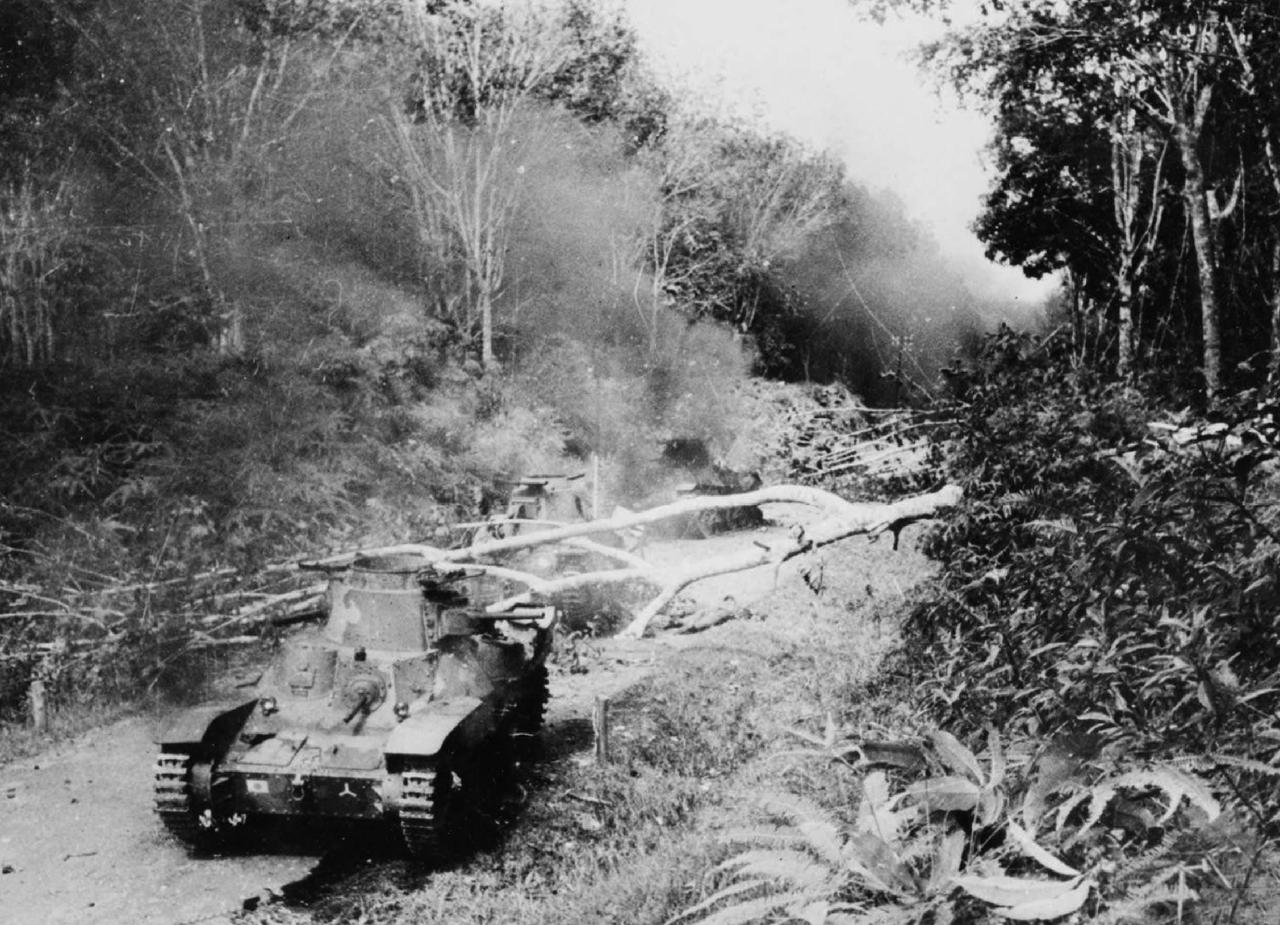 缅甸战役期间被英军伏击击毁的几辆鬼子95式轻型坦克,由于头一辆被六磅炮击毁,后面两辆被大树挡住无法动弹被挨个点名。以下关于日军在缅甸战役中战术的报告发表在1942年11月的《情报公报》上。日军总是将路障设置在道路穿过茂密丛林或路堤的地方。实际的路障几乎总是设在道路拐弯处,因此除了近距离外,从正面很难发现。这些阵地有部署得当的迫击炮、反坦克炮和机枪提供强有力的掩护。有时会设置多重路障——在瑞当,一条道路上就设有五道路障。在丛林密布的复杂地区,路障两侧的防御区域通常不会从道路向后方延伸太远。 f. 夜间行动 日军的夜间进攻通常在19时左右发起(天黑前后)。他们在夜间行动时很少使用侦察兵,且在使用摩托化运输工具时颇为大意——例如,卡车行驶时开着常规大灯。 在战役后期,日军几乎完全改为夜间行动、白天休整。在这些休整时段,他们的局部防御十分薄弱,很容易遭到突袭。 g. 第五纵队 在缅甸,第五纵队成员的数量和活跃度可能超过了参战国中的任何其他国家。他们有时被日军用作先头部队的掩护,在各地活动时向日军传回防御部队的情报。任何为诱捕日军而设的埋伏,通常都会被这些第五纵队成员泄露。 2. 美国观察家评论 a. 概况 在大多数情况下,日军的兵力多于英军。除坦克外,他们通常也拥有更多装备。 b. 具体方面 (1)巡逻——由于缺乏骑兵和车辆,英军几乎只能完全依靠步兵执行侦察和警戒任务。有时这些部队不得不前出到主力部队前方15英里处。结果,他们常常疲惫不堪,无法有效作战,而他们的损失也极大地削弱了步兵作战单位的战斗力。 (2)骑兵——缅甸的大部分地形非常适合使用骑兵。当地的小马比我们美国的骑兵马更适用。骑兵装备应配备大量轻机枪和汤姆逊冲锋枪。 (3)运输——英军面临严重的运输问题,特别是因为渡船短缺且铁路人员流失(日军进入缅甸时,几乎所有当地铁路人员都弃职逃走了)。 美国吉普被证明是非常适合指挥官、联络官、传令兵以及运送机枪和迫击炮的理想车辆。 防御部队对遗弃车辆的销毁工作做得不够彻底。 (4)炮兵——一些英军部队发现,一个炮兵连配备4门炮比6门好,因为更易于操作。 (5)散兵坑——事实证明,这些散兵坑非常有效,除非被直接命中或炸弹击中坑附近的树梢。