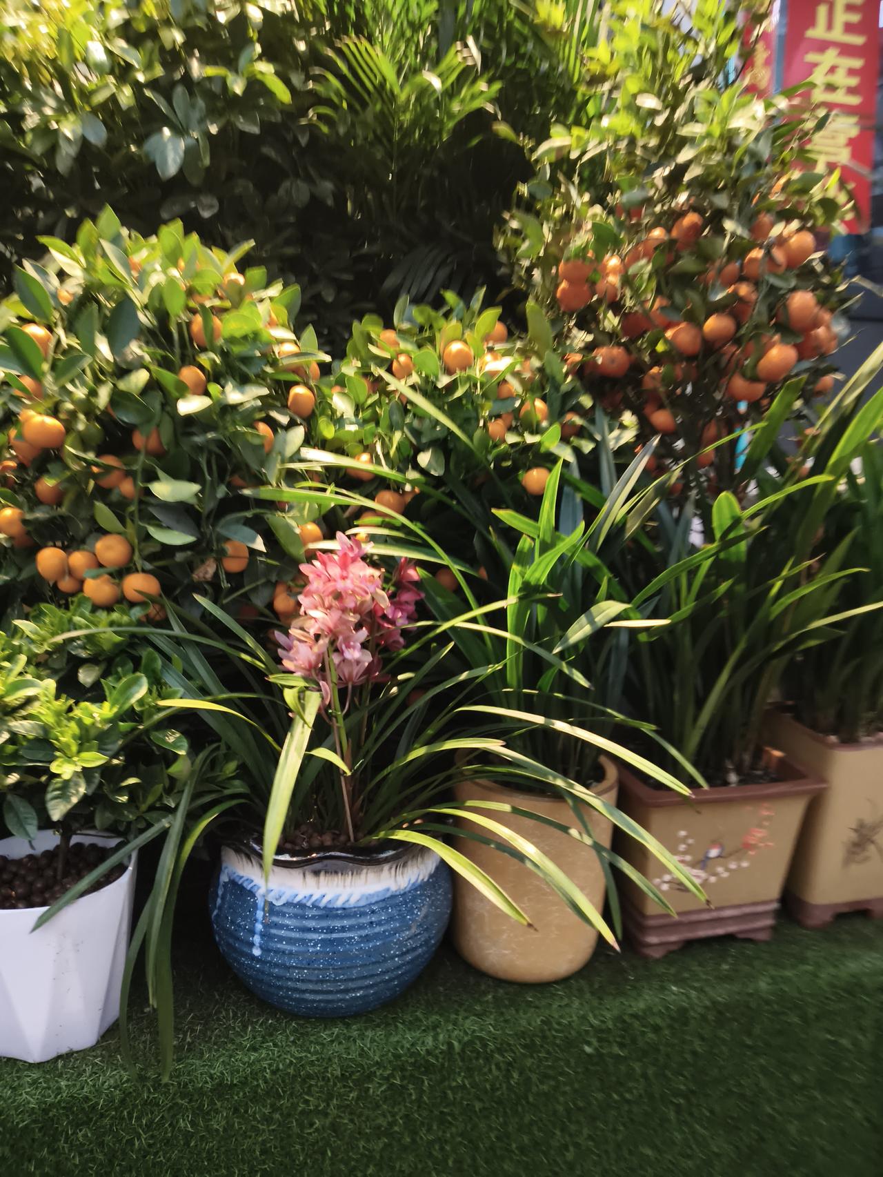 前方的大花蕙兰舒展着修长的叶片,粉紫色的花穗亭亭而立,花瓣层层叠叠,在微风里轻轻摇曳,温柔又明媚。旁边的墨兰静静伫立,深绿的叶片挺拔如剑,为这方小天地添了几分清雅。 铺着仿真草皮的地面,让这些盆栽多了几分自然野趣。年桔的吉祥、兰花的雅致,在冬日的光影里交织成一幅温暖的画面,仿佛把春天的气息提前带来,让人忍不住驻足,感受这份鲜活的生命力。