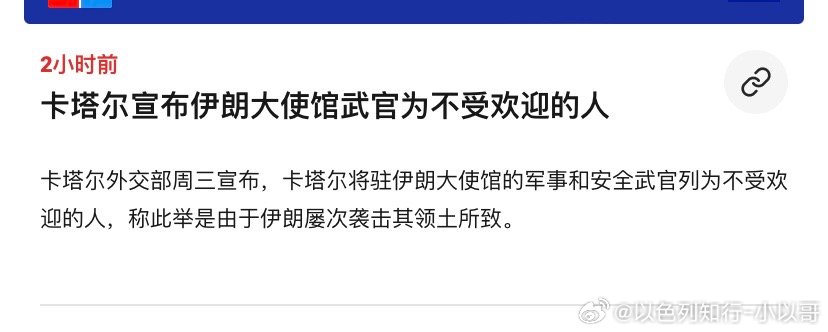 打卡塔尔?革命卫队明显很慌乱了。以色列袭击伊朗和卡塔尔联合开发的天然气田之后,伊朗不打以色列的气田,竟然打了卡塔尔的气田。这不是把卡塔尔进一步推向美国和以色列么。。。卡塔尔大骂伊朗,并要驱逐伊朗大使馆的武官。伊朗说中东三国石油设施成为合法打击目标海外新鲜事