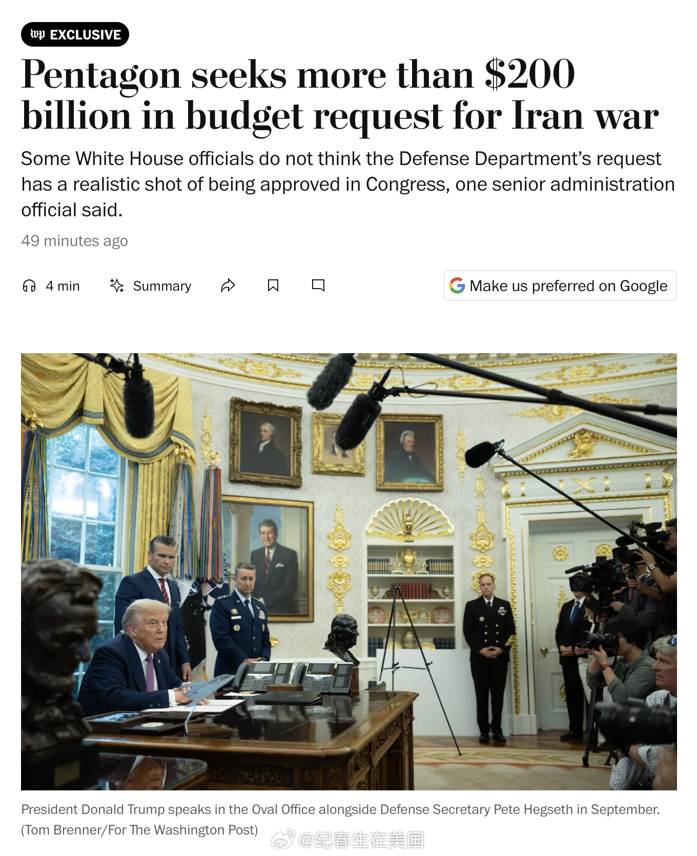 :五角大楼已请求白宫批准向国会提出超过2000亿美元的拨款申请,用于资助对伊朗的战争。一名政府高级官员表示,这一规模巨大的新请求几乎肯定会遭到反对冲突的议员抵制。