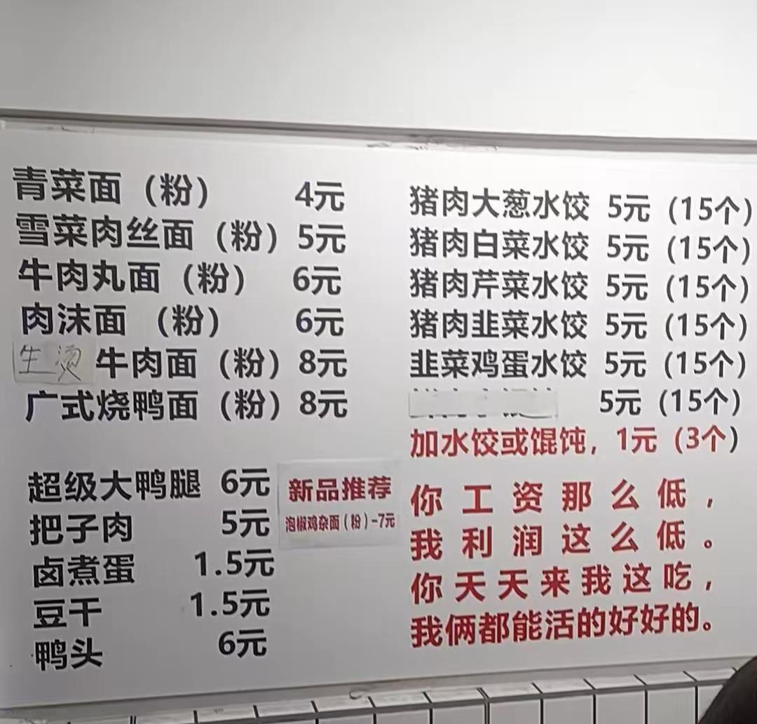 这家店的老板要是搁在古代,绝对是侠客转世。但我今天不想夸他良心,我想从另一个扎心的角度聊聊这件事。 店里的招牌上,除了价格,老板还写了一段话:“你工资那么低,我利润那么低,你天天来我这吃,我俩都能活得好好的。” 第一次看这句话,心里咯噔一下。 这哪是生意经啊,这分明是两个底层小人物在互致问候、促膝谈心。 咱们换个角度看这件事。以前我们总说“无奸不商”,觉得开店的恨不得掏空你口袋,但这个老板却把“你工资低”当成定价的依据。 说白了,他不是在卖水饺,他是在给这附近的打工者,提供一顿不那么贵的午餐。 一碗面4块钱,这是什么概念?在现在的广州,你去哪个快餐店不得20起步? 这价格,基本就是贴着成本在走,老板自己说的:“我赚的是辛苦钱”。 有人可能会嘀咕:这么便宜,能有好东西吗?可人家老板精着呢,他说“虽然价格便宜,但我也要选择在成本能接受的范围内品质最好的”,砸招牌的事不能干。 看到了吗?这才是人间清醒。他知道自己的客户是谁,是那些工资不高、可能还穿着工装的普通人,是那些可能刚毕业还在苦撑的年轻人。 为什么这家店能爆火?不是因为大家缺那几块钱,是因为大家缺这种被理解的温暖。 在这个满大街都是“雪糕刺客”的时代,在大家觉得物价飞涨工资不涨的当下,有个人站出来说:“我不赚大钱,我陪着你熬过去。”这份共情,比任何山珍海味都下饭。 说实话,看到那句“你工资那么低”,我鼻子有点酸。因为真正刺眼的不是那5块钱的水饺,而是“工资那么低”这五个字。 老板懂你的囊中羞涩,也懂你的体面。他用最低的利润,守住了普通人最后的一点尊严。 在这个繁华都市的一角,还有这样一个小店,能让那些为了生活奔波的人,花5块钱,体面地吃饱。这哪里是水饺,这分明是寒夜里可以让你感受到温暖的一盏灯。