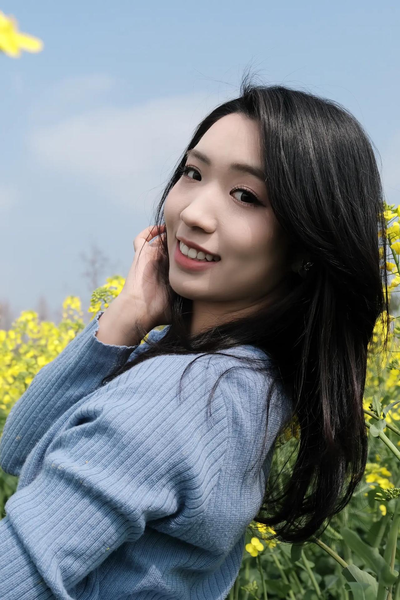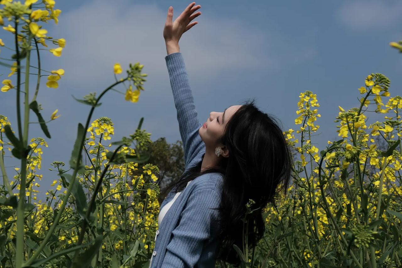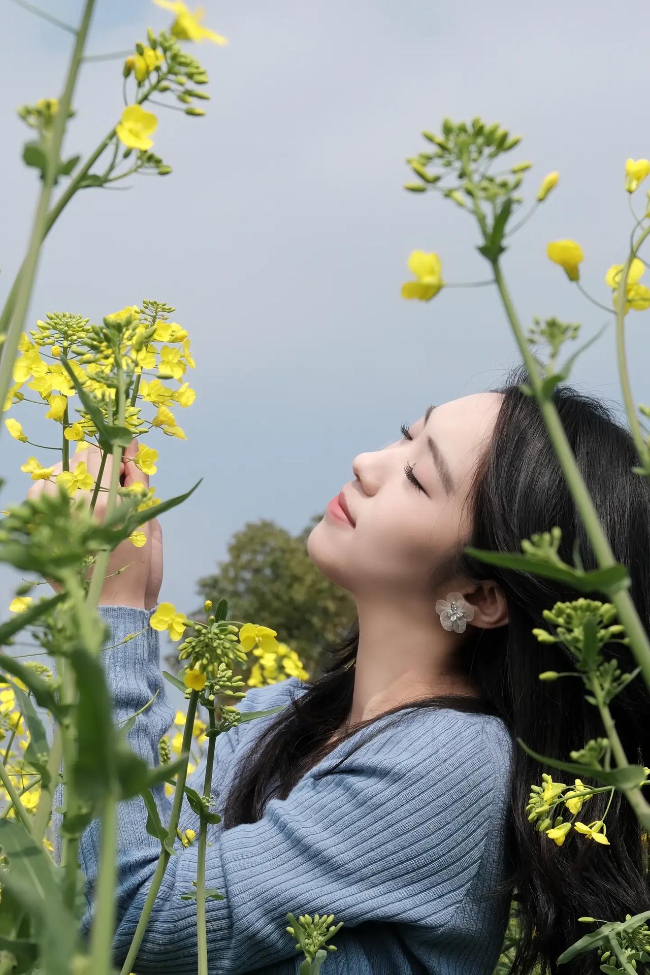《晴郊闲坐》晴光漫洒碧芳丛,裙裾轻沾碎蕊风。云鬓垂肩凝晓露,蓝衫贴体衬娇