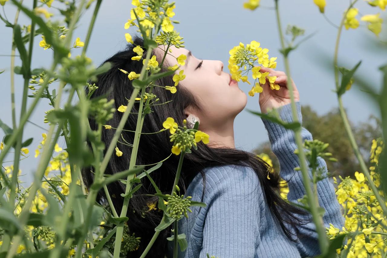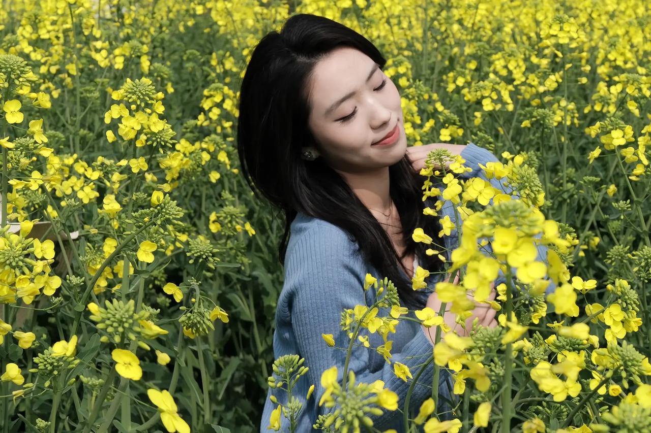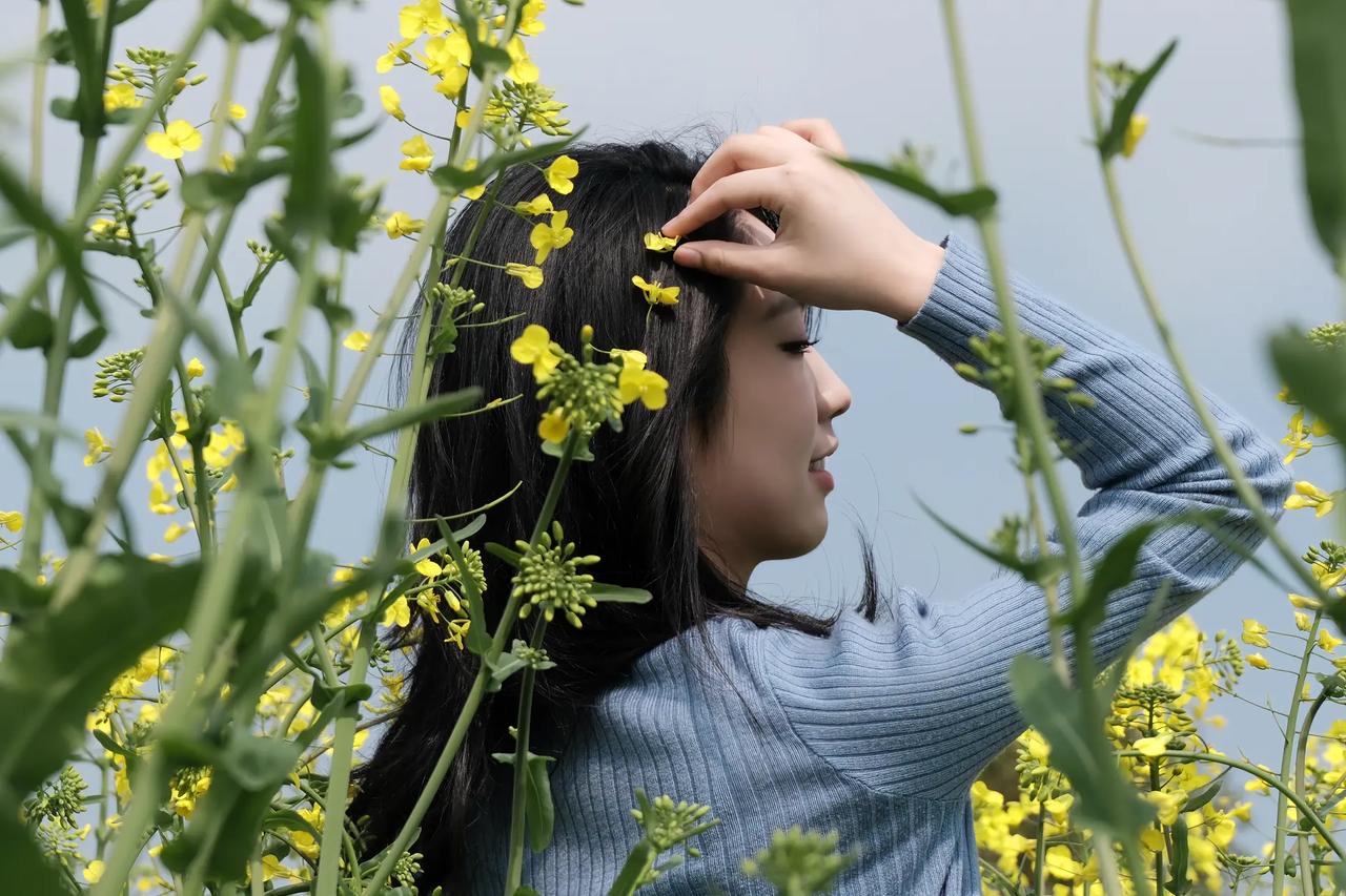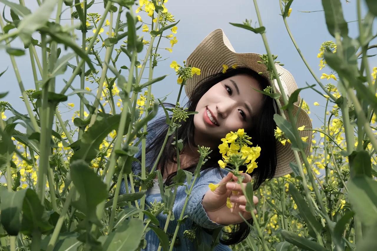 《晴郊闲坐》晴光漫洒碧芳丛,裙裾轻沾碎蕊风。云鬓垂肩凝晓露,蓝衫贴体衬娇