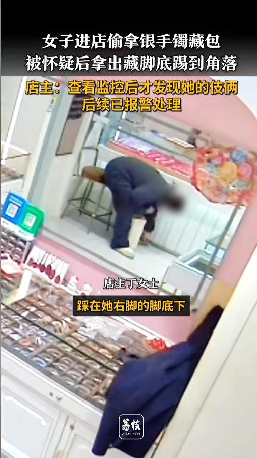“必须严惩!”近日,江苏南京,一女子在饰品店看银镯子,竟偷偷偷了一个,装进了自己的包里。店主发现镯子不见后,赶紧寻找,又联系了老板娘一起,女子想走也被拦下。她见自己走不了了,就将镯子偷偷放在脚下,朝柜台踢去。网友:抓进去教育! 据媒体3月13日报道,事发当日,一女子到店里选购银手镯,她穿着比较宽大的袖子,趁店主不注意,偷了一个镯子,藏进了自己的包里。 店主发现女子一直在镯子的乱摸,心里起了怀疑,看的更紧了很快,她发现镯子少了一个,就问女子有没有看到,女子回答没有。 店主着急了,赶紧四下寻找,又打电话叫来隔壁的老板娘。这时候女子起身想走,店主不肯,得先找到镯子。 女子见自己逃走无妄,便趁着二人不注意,把镯子踩到自己的脚下,随后站了起来,把镯子踢向柜台。很快,店主她们就找到了这个镯子,女子也随即离开。 事后,店主观看监控视频,发现了女子的小动作,才知道她到底是怎么偷的镯子,才打电话报了警。店主说,当时镯子已经找到,又不知道她到底怎么干的,怕冤枉了人家,就放走了。现在,案件正在进一步处理中。 网友看后表示,就为了一个镯子,脸都不要了,干出这种违法乱纪的事来,怕是平时人品也不咋地吧!看女子的反应,感觉不像是第一次的样子,一定得好好查查! 信息来源:《女子偷银镯被发现后踢到角落 店主回应女子偷银镯被发现 :查看监控后才发现她的伎俩 后续已报警处理