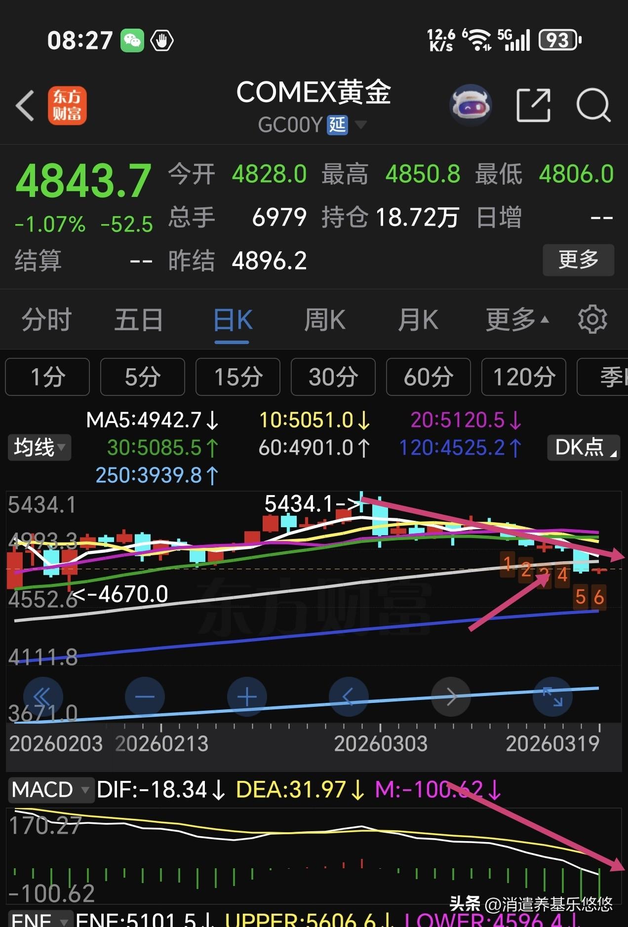 昨天石油大涨超3% ,目前国际石油继续上行涨3%,马上就要到了100美元每桶,这样下去对对股市太不友好啦,主力资金趁机打劫,有继续砸盘的可能,上证指数回调到4000点以下不是没有可能,创业板指数回补下方缺口概率很大,本周不跌下周兑现,反弹就减仓降低仓位。 国际黄金现在已经跌破了5000美元每盎司,目前已经跌破了60日线支撑(如下图所示),趋势下跌中。美联储降息预期落空,直接压制黄金白银反弹,包括有色金属等大宗商品都会承压。