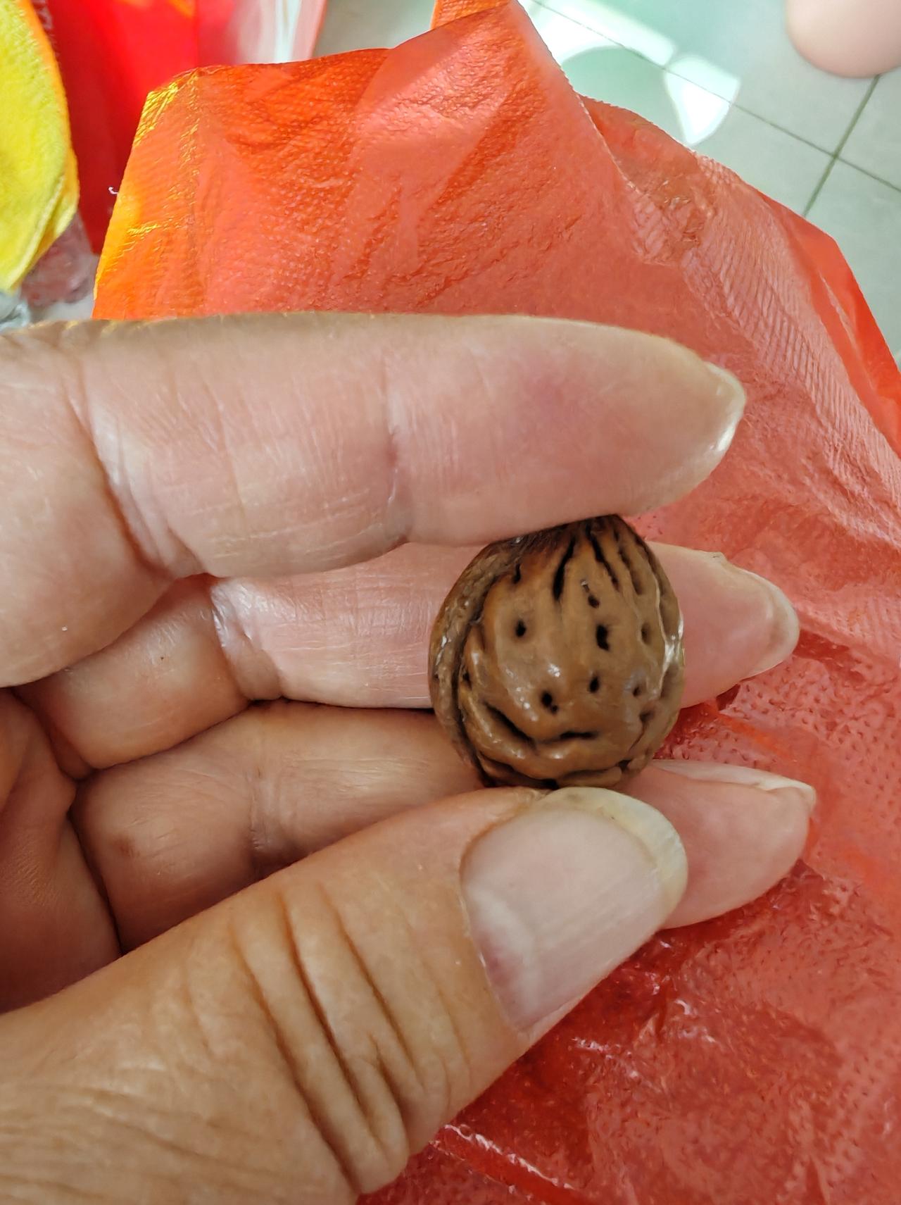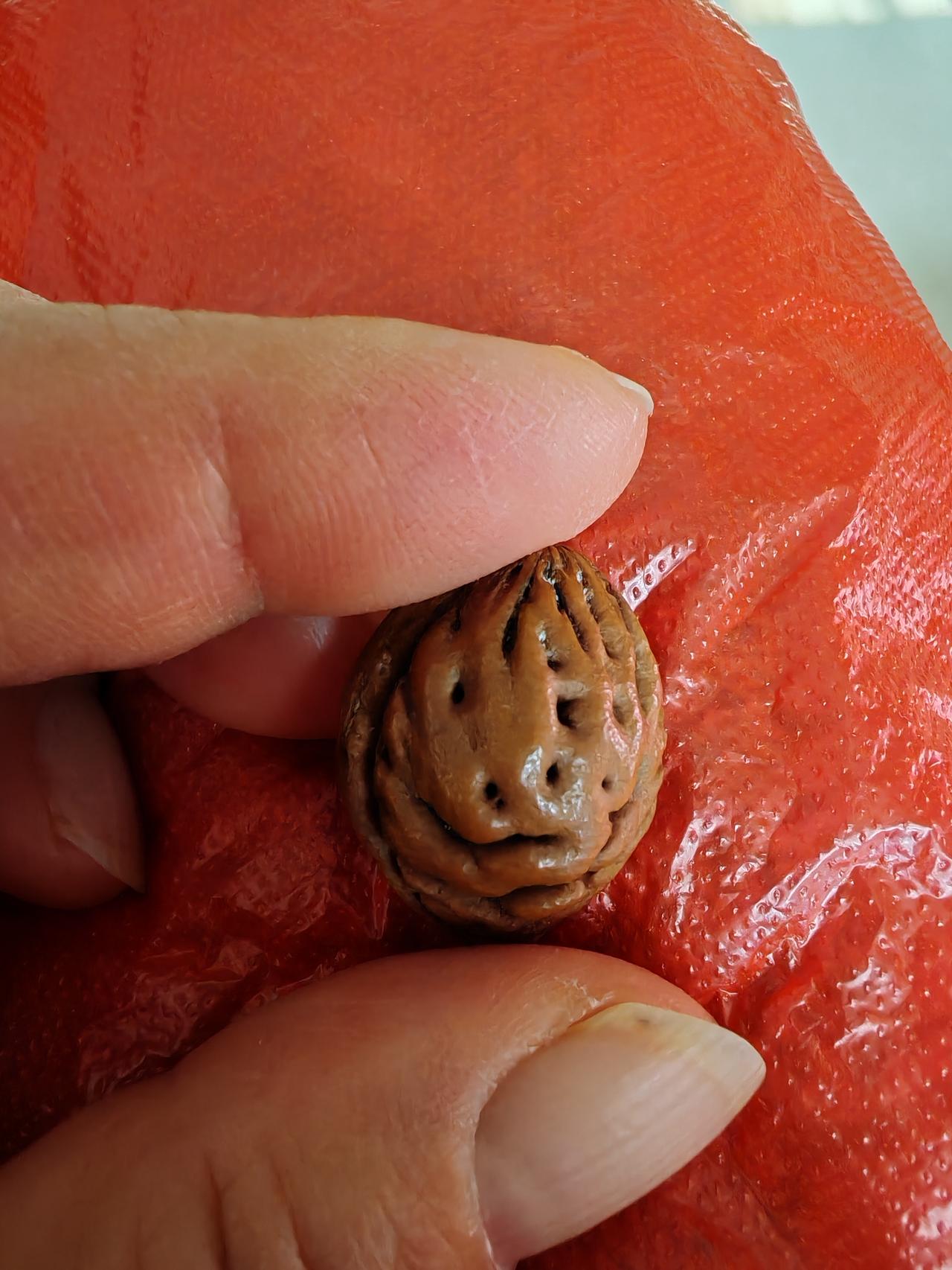 这枚桃核很萌的,像头牛的脸。 眼睛、鼻子、嘴巴都清晰可辨。 请仔细看一看,是不是