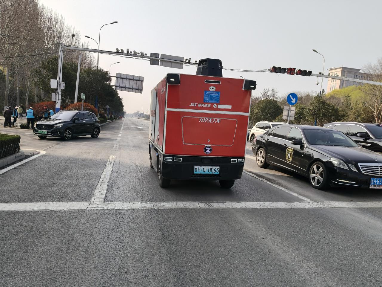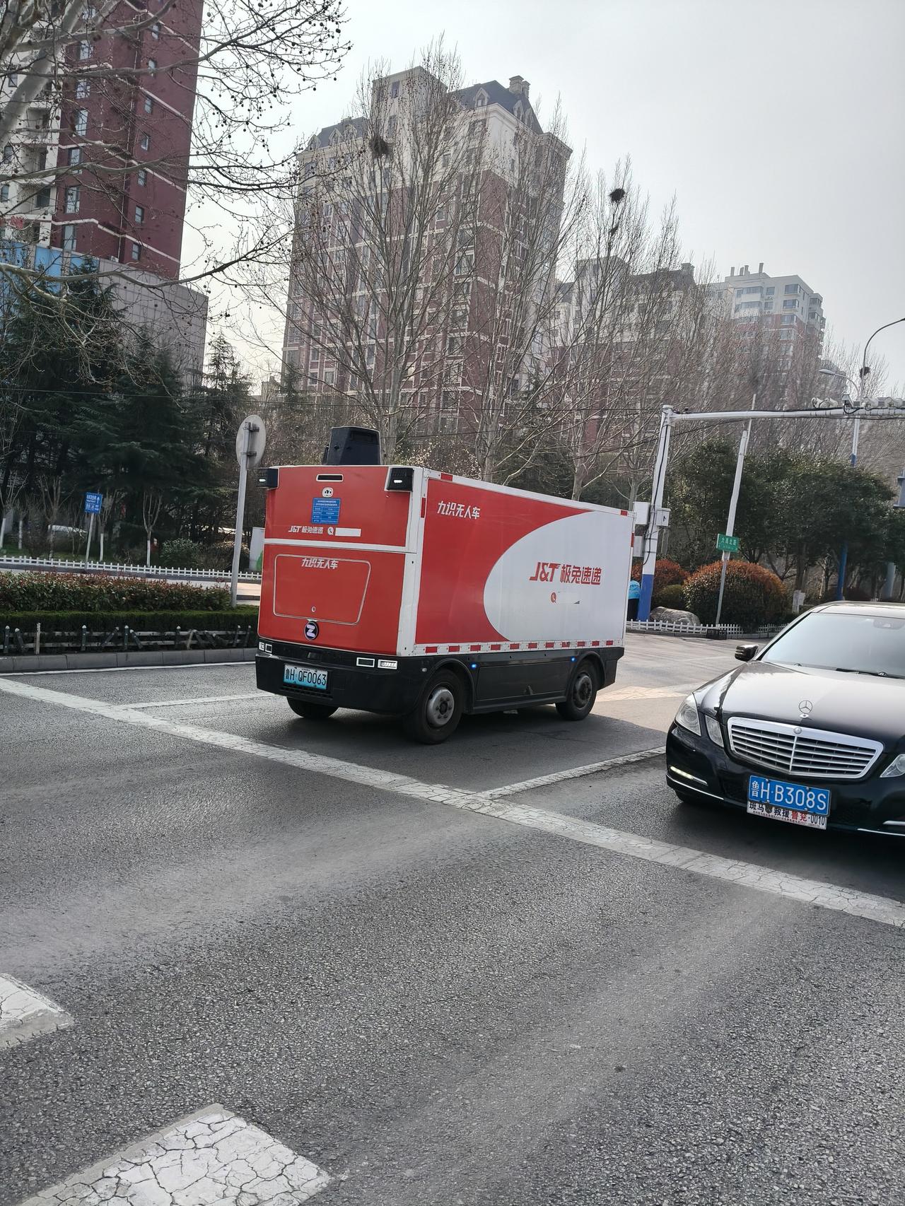 无人驾驶送货车居然在大兖洲街道行驶。 在兖州路上行走。看到等红灯处,在红灯处。有一辆无人驾驶的。极兔送货车你别说,这还是我第一次看到无人驾驶车,哎呀,严重的境界。科技真是发展啊。无人物流配送车 无人车快递配送 无人仓库物流车
