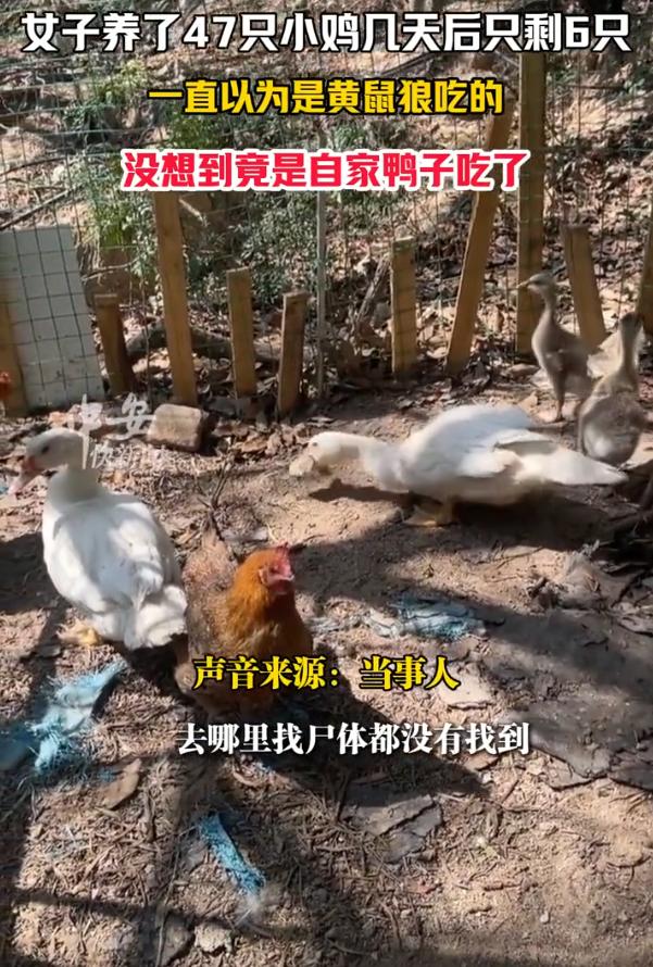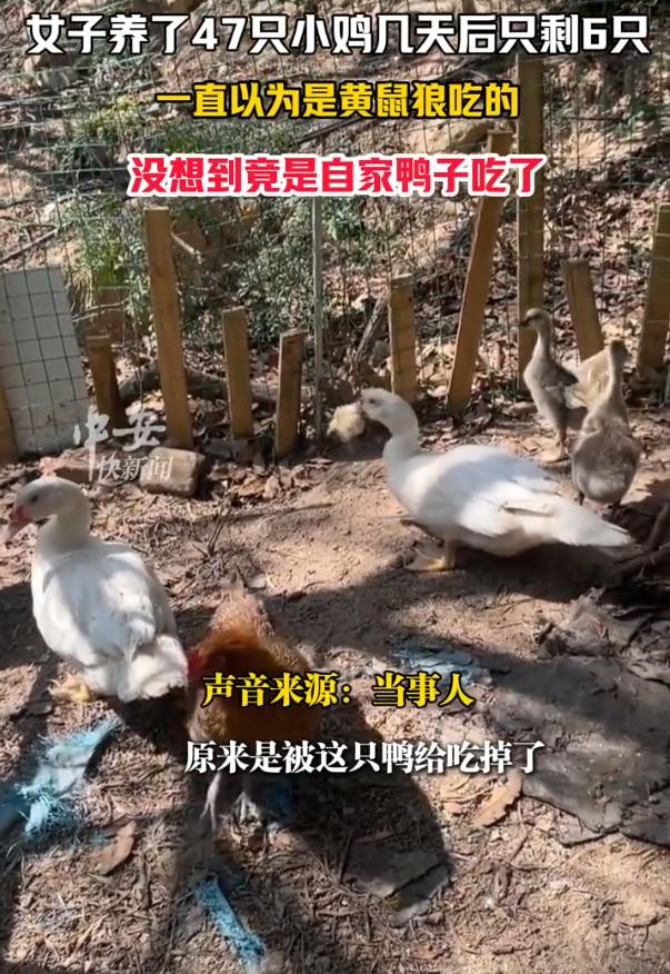 万万没想到!福建厦门,女子在院子里养了47只小鸡,结果还没养几天,就发现小鸡以肉眼可见的速度在消失,最后就剩下6只,女子还以为是家里附近有黄鼠狼,但偶然发现,吃小鸡的竟然是自家的鸭子 女子前不久买了47只小鸡崽儿,毛茸茸的养在院子里,结果没几天的功夫,小鸡就跟人间蒸发了一样,一只接一只地没影了 女子第一反应就是遭了黄鼠狼,毕竟老一辈都这么说,黄鼠狼偷鸡是天性。她里里外外找了个遍,连根鸡毛都没找着 为了保住剩下的几只,她特意把笼子加固,还整了些防黄鼠狼的工具放在院子里,可以说是严防死守。可奇怪的是,小鸡还是在减少,最后47只鸡就剩下孤零零的6只 就在她百思不得其解的时候,真相来了个超级大反转。那天她去喂食,无意中瞥见自家养的那只鸭子,鬼鬼祟祟地凑到小鸡笼子旁边。起初她没在意,结果下一秒,那鸭子张开嘴,一口叼起一只小鸡,脖子一仰,整只小鸡就被生吞了下去,动作那叫一个熟练,连嚼都没嚼 女子当时就傻眼了,合着这几天她又是怪黄鼠狼,又是怀疑老鼠和狗,唯独没怀疑过这个整天嘎嘎叫、看起来人畜无害的家贼。敢情那消失的41只小鸡,全进了这只鸭子的肚子 女子不理解,在网上求助,说鸭子不是吃草吃菜吃饲料的吗?怎么还开荤了? 其实,这还真不怪鸭子残忍,而是我们一直对鸭子有误解 首先,鸭子这玩意儿,它压根就不是纯素食主义者。在动物学分类上,鸭子的祖先是绿头鸭,在野外的食谱本来就杂,除了水草,小鱼小虾、水里的虫子,甚至是蝌蚪,逮着了都吃 。家鸭虽然被驯养了,但这吃肉的本能和基因可没丢 其次,鸭子吞食小鸡,很多时候是因为身体缺“油水”了。特别是在生长期或者产蛋期,鸭子对蛋白质的需求特别大 。如果主人平时喂的都是些粮食、菜叶子,饲料里蛋白不够,鸭子就会自己想办法开荤。在它眼里,那些毛茸茸乱跑的小鸡崽儿,其实跟平时在水里啄的泥鳅、蚂蚱没啥区别,就是一块会动的肉 而且鸭子味觉不发达,对食物没啥分辨能力,而且食道宽,喉咙硬,经常是逮着东西不管三七二十一直接吞 。别说小鸡了,你给它个拳头大的蛤蟆,它要是饿了,照样敢试着吞 这就不难解释,为什么女子家中会发现这种情况了