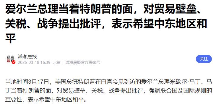 特朗普遭遇耻辱一幕,爱尔兰总理说出了,英国人不敢说的话。 当地时间3月17日,爱尔兰总理米歇尔·马丁携夫人访问华盛顿,双方在白宫举行公开新闻发布会,原本是一场彰显双边友好的外交活动,谁也没料到,特朗普竟当场失了分寸,当着马丁的面,毫无顾忌地细数英国首相斯塔默的种种不是。 特朗普先是假意夸赞美英关系深厚,称两国是历史最悠久、最牢固的盟友,话锋一转就话里带刺,吐槽斯塔默上台后,彻底搞砸了美英关系。 他直言不讳地抱怨,自己曾要求斯塔默派几艘扫雷舰,协助美国排查霍尔木兹海峡的水雷,可斯塔默始终不配合,直到美国基本摧毁伊朗军事力量、大局已定,才勉强同意派航母过来,纯属“马后炮”。 除此之外,特朗普还指着椭圆形办公室里的丘吉尔雕像,吐槽斯塔默根本比不上丘吉尔,没有一点首相的魄力,言语间满是轻视和不满。 特朗普本以为,自己这番指责会得到马丁的附和,毕竟爱尔兰和英国虽为邻国,过往也有不少分歧,可他万万没想到,马丁不仅没有迎合,反而当场“拆台”。 面对特朗普的滔滔不绝,马丁神色平静,语气坚定地表示,斯塔默是个诚恳的人,他觉得特朗普完全有能力与斯塔默共事,一句话轻飘飘,却直接推翻了特朗普对斯塔默的所有负面评价,丝毫没有给这位东道主留面子。 要知道,当时全场都有记者在场,所有话语都被实时记录、直播,特朗普脸上的得意瞬间僵住,场面一度十分尴尬,那种被当场反驳的窘迫,怕是他从政以来都少见。 可能有人会好奇,为什么英国人自己不敢说的话,爱尔兰总理却敢直言不讳? 其实答案很简单,英国和美国是传统盟友,斯塔默政府很多时候都要顾及美英关系,即便对特朗普的指责有异议,也只能忍气吞声,不敢当场反驳,生怕影响两国在军事、贸易等领域的合作。 但爱尔兰不一样,虽然和美国也有密切合作,却在外交上始终保持相对独立的立场,而且马丁本身就主张多边主义,重视国际规则,不喜欢趋炎附势。 更何况,斯塔默此前曾访问过爱尔兰,双方正努力重置关系、增进合作,马丁替斯塔默说话,既是对斯塔默本人的认可,也是出于两国关系的考量。 更值得一提的是,当天马丁不仅反驳了特朗普对斯塔默的指责,还当着他的面,批评了他的关税政策和对战争的态度,强调联合国及国际规则的重要性,希望中东地区能实现和平。 面对马丁的接连“批评”,特朗普全程强装微笑,没有当场发作,可明眼人都能看出他的不满和窘迫。毕竟,他原本想借着这场发布会,彰显自己的强势,没想到却被爱尔兰总理当众“打脸”,不仅没能贬低斯塔默,反而让自己沦为了国际社会的笑柄。 这场看似普通的外交发布会,背后其实藏着外交最基本的原则——相互尊重。 特朗普身为东道主,当着客人的面,随意指责第三方国家领导人,本身就是不合时宜、缺乏风度的行为;而马丁敢于直言不讳,不卑不亢,既坚守了自己的立场,也说出了很多英国人想说却不敢说的话。 外交不是居高临下的指责,也不是趋炎附势的讨好,而是平等相待、相互尊重。特朗普这次的尴尬遭遇,也给所有国家提了个醒,再强大的国家,也不能随意轻视他国领导人,否则只会自食恶果。 而爱尔兰总理马丁的做法,不仅维护了斯塔默的声誉,也展现了一个国家的底气和风度,这才是真正的外交风范,也难怪他能说出英国人不敢说的话,赢得国际社会的认可。
