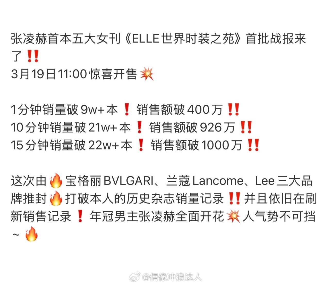 张凌赫杂志张凌赫ELLE杂志销量开售1分钟9w本+,销售额400w+开售15分钟23w本+,销售额破1000w+