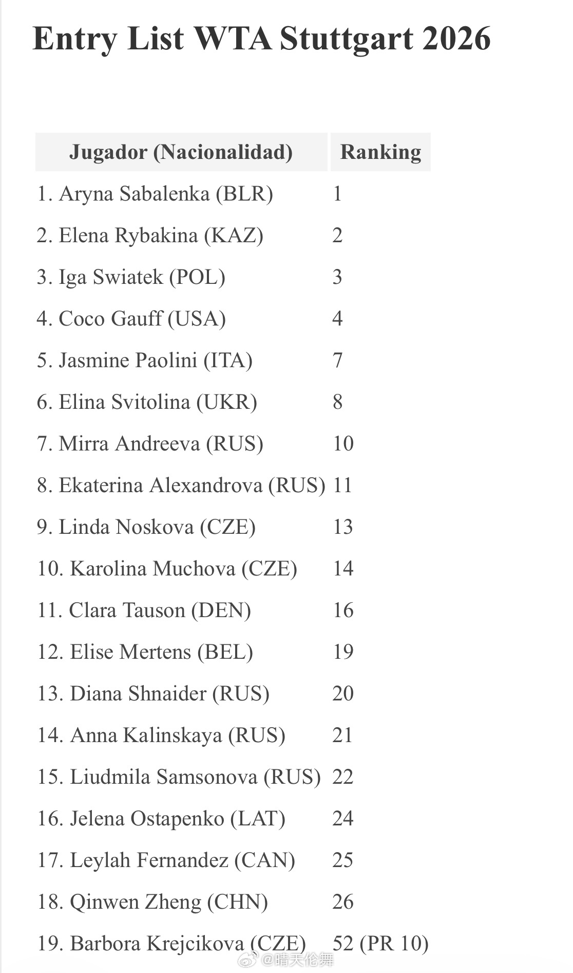 郑钦文入围最卷500赛 斯图加特WTA500正赛名单(4.13)七位Top10球员携手出战,郑钦文最后一个入围,这应该是目前最卷500赛了吧!萨巴伦卡🇧🇾莱巴金娜🇰🇿斯瓦泰克🇵🇱高芙🇺🇸保利尼🇮🇹斯维托丽娜🇺🇦安德列娃🇷🇺克雷吉茨科娃🇨🇿(SR)亚历山德罗娃🇷🇺诺斯科娃🇨🇿穆霍娃🇨🇿陶森🇩🇰梅尔滕斯🇧🇪施内德🇷🇺卡琳斯卡娅🇷🇺萨姆索诺娃🇷🇺奥斯塔彭科🇱🇻费尔南德斯🇨🇦郑钦文🇨🇳利斯🇩🇪(外卡)西格蒙德🇩🇪(外卡)赛德尔🇩🇪(外卡)wta
