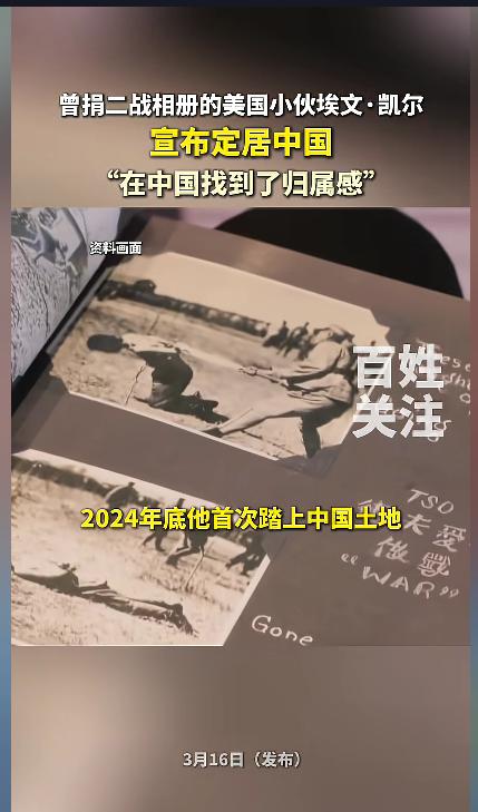 “真正的朋友!”近日,美国小伙埃文凯尔发视频,宣布自己定居中国了。此前,他曾将记录南京大屠杀等侵华罪证的二战相册,无偿赠予了中国,也因此获得了中国回赠的国礼瓷器。后来,他曾多次来到中国,在中国找到了归属感。网友:欢迎外国友人! 朋友来了有好酒,若是那豺狼来了,迎接他的有猎枪。正如歌里面唱的那样,中国人对真正的朋友,从不吝啬。 据媒体3月16日报道,埃文凯尔发视频称,“告诉大家一个小秘密,我定居中国啦”,IP属地为天津。 2022年,他曾将一本记录了侵华日军罪行的相册,无偿捐献给了中国,其中就有关于南京大屠杀的证据。为此,他甚至还受到了人身威胁。 后来,中国政府赠送给了他一件国礼瓷器。迄今为止,以个人身份获此殊荣的仅有3位。 2024年,他第一次来到中国,就爱上了这片土地。原本只计划待30天的他,足足待了90天。从那之后,一发不可收拾,他不停地往返于中美之间,还受邀上了春晚。 他在中国,走遍了40多个城市,体验了中国的各种文化,被深深地折服了。他说,中国就是我第二个家,我在这里找到了归属感。 网友看后表示,每一个获得国礼瓷的外国人都是中国人真正的朋友,真心地欢迎他的到来。相信以后的日子里,他会更加爱上中华文化,爱上这片生机勃勃、充满了爱的土地! 信息来源:《曾捐二战相册的美国小伙埃文·凯尔,宣布定居中国。》百姓关注
