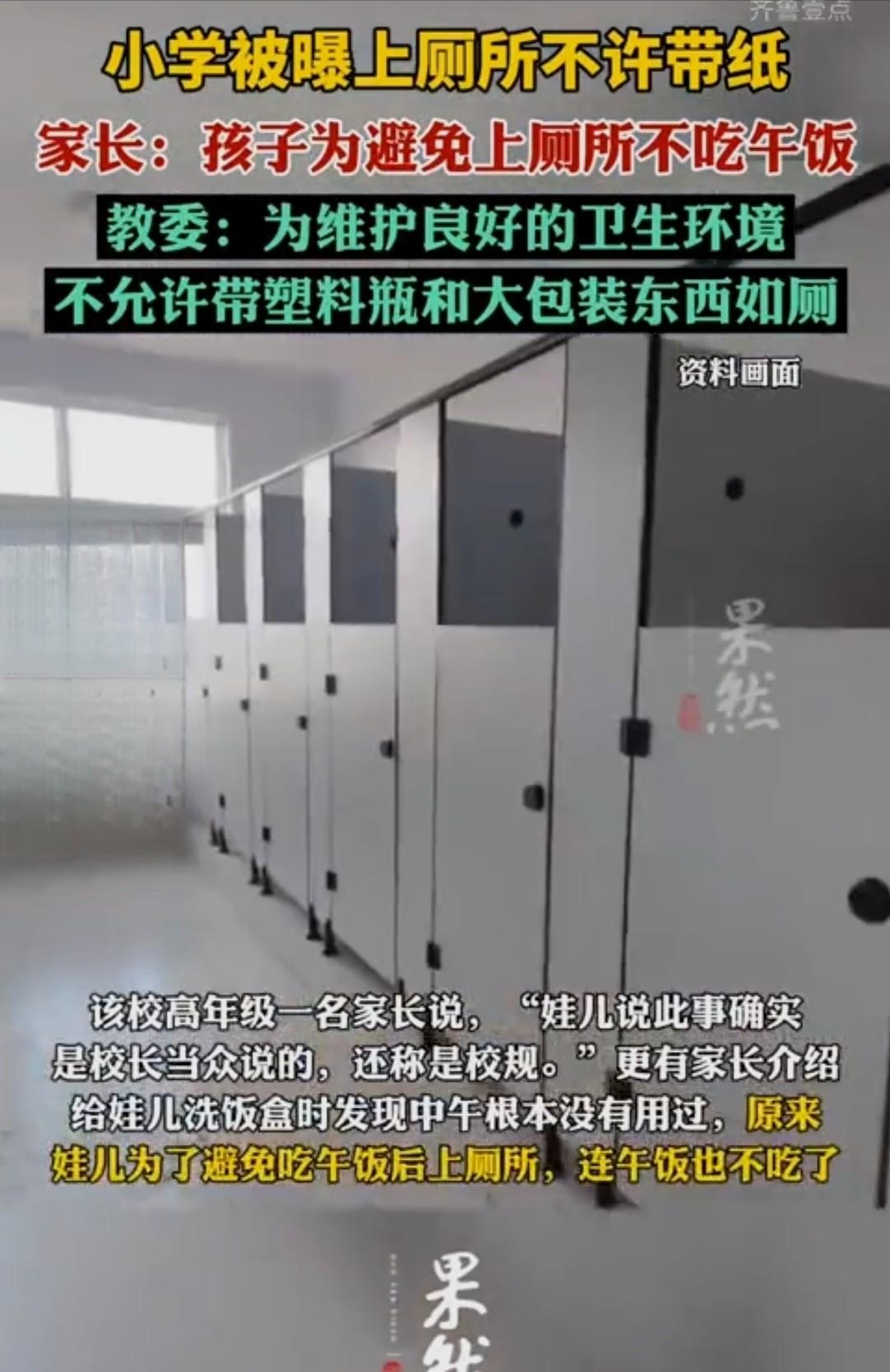 太离谱!重庆,家长在给孩子刷饭盒时,发现干净的像没用过一样,仔细一问,孩子说,学校规定上厕所不让带纸。女生不带纸无法上厕所,有的就不敢吃中饭了。家长还了解到,很多孩子都有这种情况,有的孩子把纸藏在衣服袖子里才敢上厕所。家长:高年级的女生,生理期怎么办? 一个饭盒,白得发亮,干净得像刚从包装盒里拆出来。 2026年3月,重庆江津区珞璜实验小学,一个普通工作日的中午。家长刷碗时顺手接过孩子的饭盒,愣了——一粒米没有,一滴油不见,表面滑得能照出人影。这娃中午到底吃了什么?她把这句话抛进家长群,炸出一片同款疑惑。 深挖下去,真相让人后背发凉。 孩子们说,学校出了一条禁令:上厕所严禁带纸。理由呢?怕冲纸堵了下水道。 于是出现了这样的画面:正值发育期的孩子,宁可饿着肚子,也不肯动筷子。逻辑荒诞到让人想哭——不吃饭,肠胃就不动,不内急就不用上厕所,不上厕所就不用面对那个没有纸的厕所。 有的孩子会悄悄把纸条藏进袖子里,小心翼翼地避开老师的目光,动作又紧张又机灵,像在偷偷完成一件秘密任务。而高年级女生赶上生理期怎么办?忍着。这种事,难道还能憋回去? 家长群炸锅了。一位妈妈直接在群里撂下一句话:高年级女生要是正来例假,不用卫生巾难道要憋到窒息? 大家七嘴八舌出主意:担心下水道堵,放个垃圾桶不就完了?纸用完扔桶里,定期清理,既解决了排污,也照顾了孩子的基本需求。这方案简单到不能再简单,最基础的垃圾桶钱,难道学校还想省? 有家长直接告诉孩子:这条破规定可以不听,有事冲我来。 事情捅到媒体那儿,校方的回应干脆利落:没这回事,没发过文件,子虚乌有。可问题是,一个孩子乱说可能是撒谎,这么多孩子众口一词,难道全是撒谎精? 家长转而投诉到江津区教委。区教委先说归基教科管,让家长继续打电话。基教科接诉后表态积极,说正在核查,处理结果出来该追究谁就追究谁。 结果几天后追问,整改已完成。可具体经办的科室却说,这事压根没经过他们手,也没派人去过学校。好家伙,一场投诉,三种命运,最后踢成了空欢喜。 直到官方统一口径说已到校复核,确认没说过"严禁带纸",只是出于环境考虑不让带塑料瓶和大包大裹的垃圾进厕所。孩子们后来说,现在确实没人管了。饭盒又变脏了,孩子终于能大口吃饭了。 可这中间绕的那一圈,足以让人看清某些部门日常运转的真实效率。 《学校卫生管理条例》白纸黑字写得明白:学校必须保障厕所等基本卫生设施。这在法律层面是逃不掉的责任。可一纸口头禁令就能让1300个孩子连基本的生理尊严都成了奢侈品,省的不过是几个垃圾桶和几个清洁小时的工钱。 整个链条最让人寒心的不是禁令本身,而是孩子们的反应——没有质疑,没有反抗,只有自我规约。饿着肚子是一种选择,把纸藏进袖子是一种选择,唯独叫板不在选项里。为什么?因为在这个森严的小环境里,他们学的最多的就是闭嘴从众。 说到底,这又是一起典型的"命令大变味"。最初的意图可能只是让孩子别往厕所扔杂物,但层层传达中没人把它翻译成温和的语言,到了学生那里只剩下两个字:严禁。结果细皮嫩肉的孩子承担了全部代价,而省下的不过是管理者屁股下那点安稳。 下水道没被冲炸,禁令无声消解,饭盒恢复了应有的油渍。这算是赢了?算了吧。只是提醒所有学校:管理,请先长颗人心。 参考信息:担心堵塞下水道,上厕所不许带纸?家长称学校出台不合理规定。学校否认,重庆市江津区教委回应 2026-03-16 15:47·生活帮