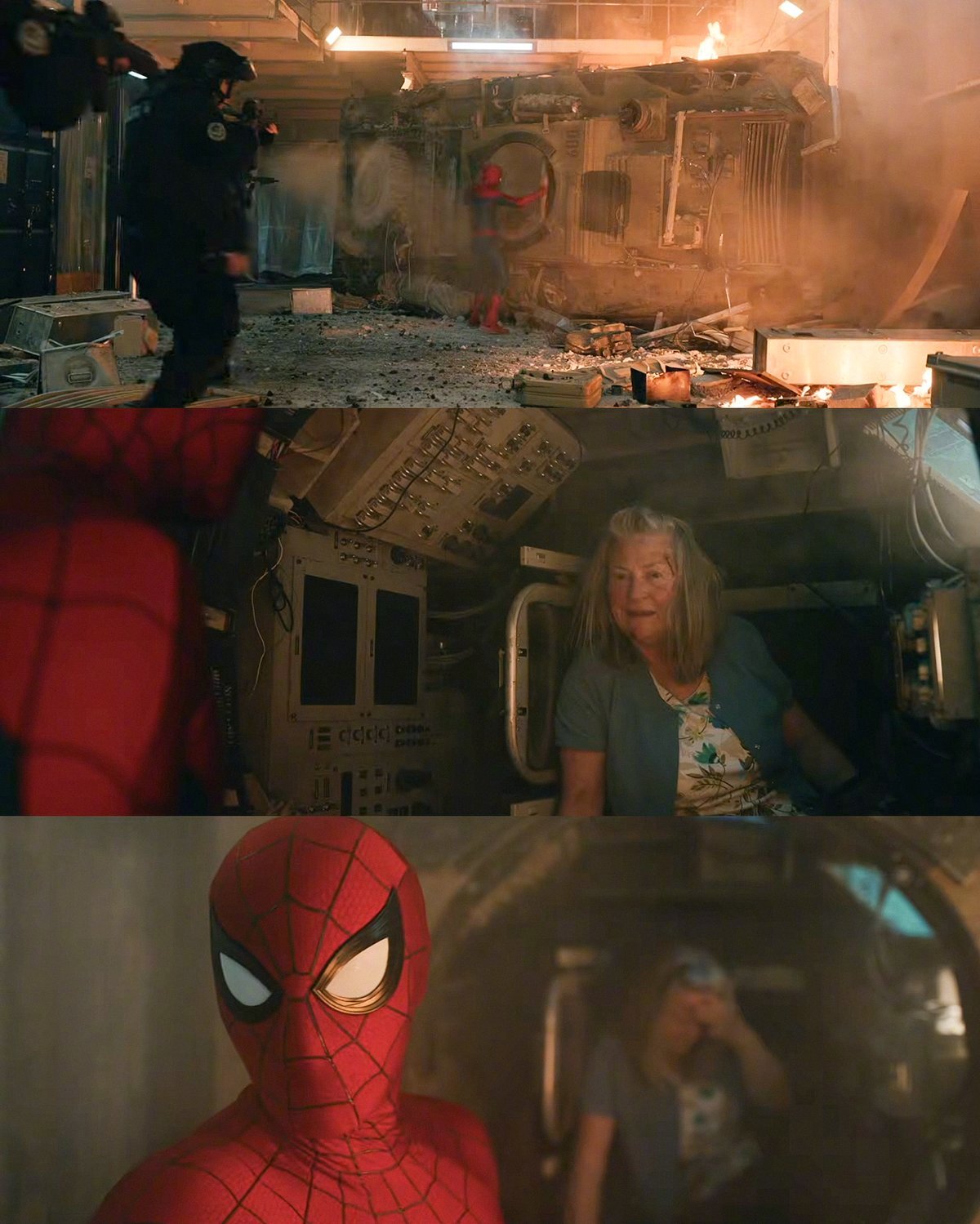 3️⃣蜘蛛侠潜入DODC/手合会设施。预告片显示:• 守卫被念力控制(琴在帮助彼得)• 通过念动力扭断脖子(琴在自卫)• 老妇人驾驶坦克(琴在附身他人)(图3)• 大规模破坏(琴的力量被释放)彼得将她救出。他们一起逃脱(图4)