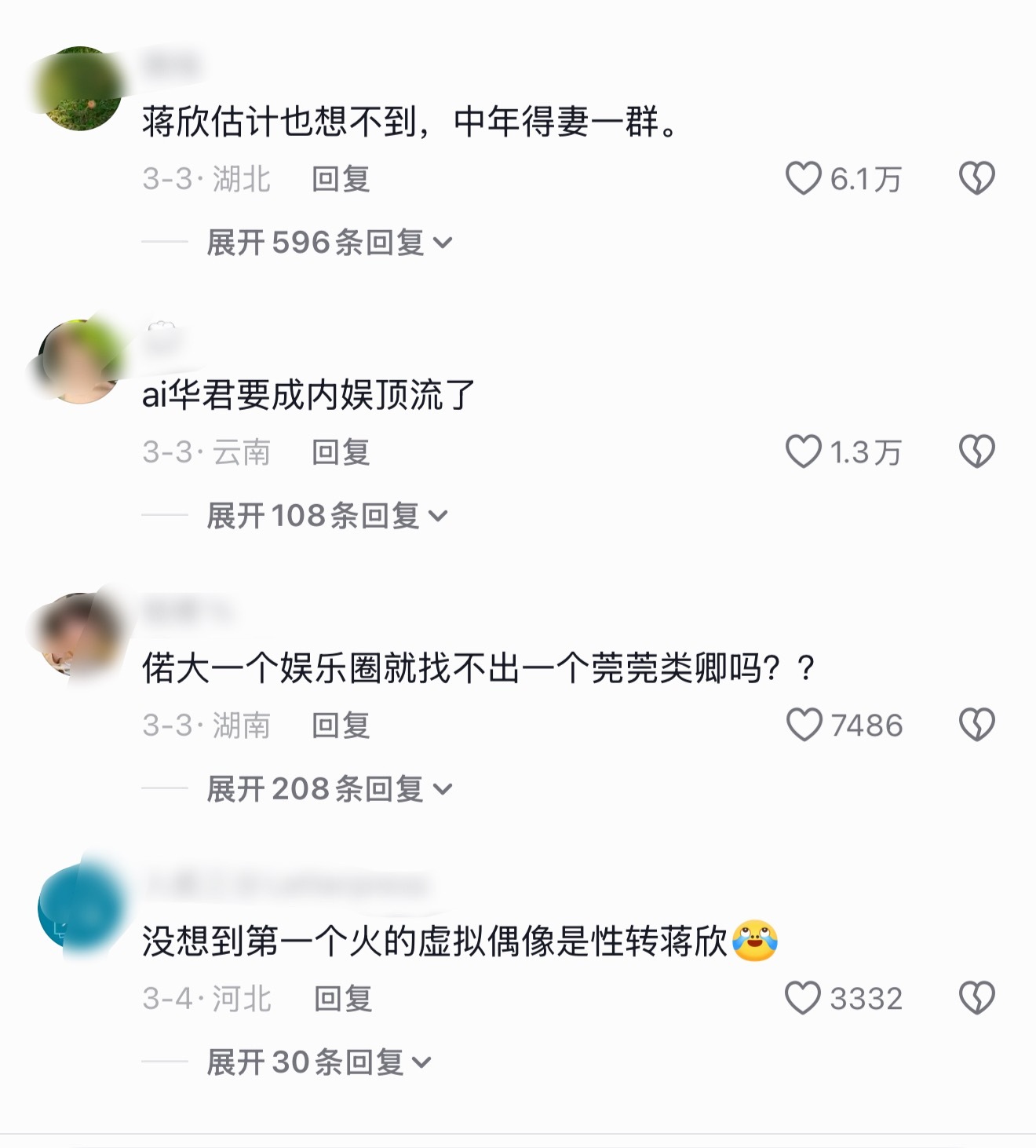 蒋欣评论区沦陷了,因为那个华君ai很火,居然有不少人留言要她赶紧生个儿子…