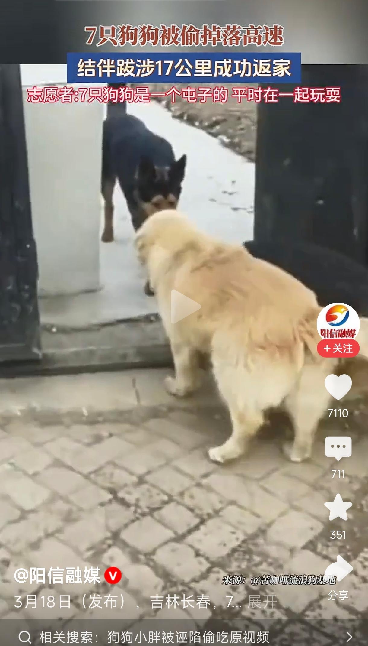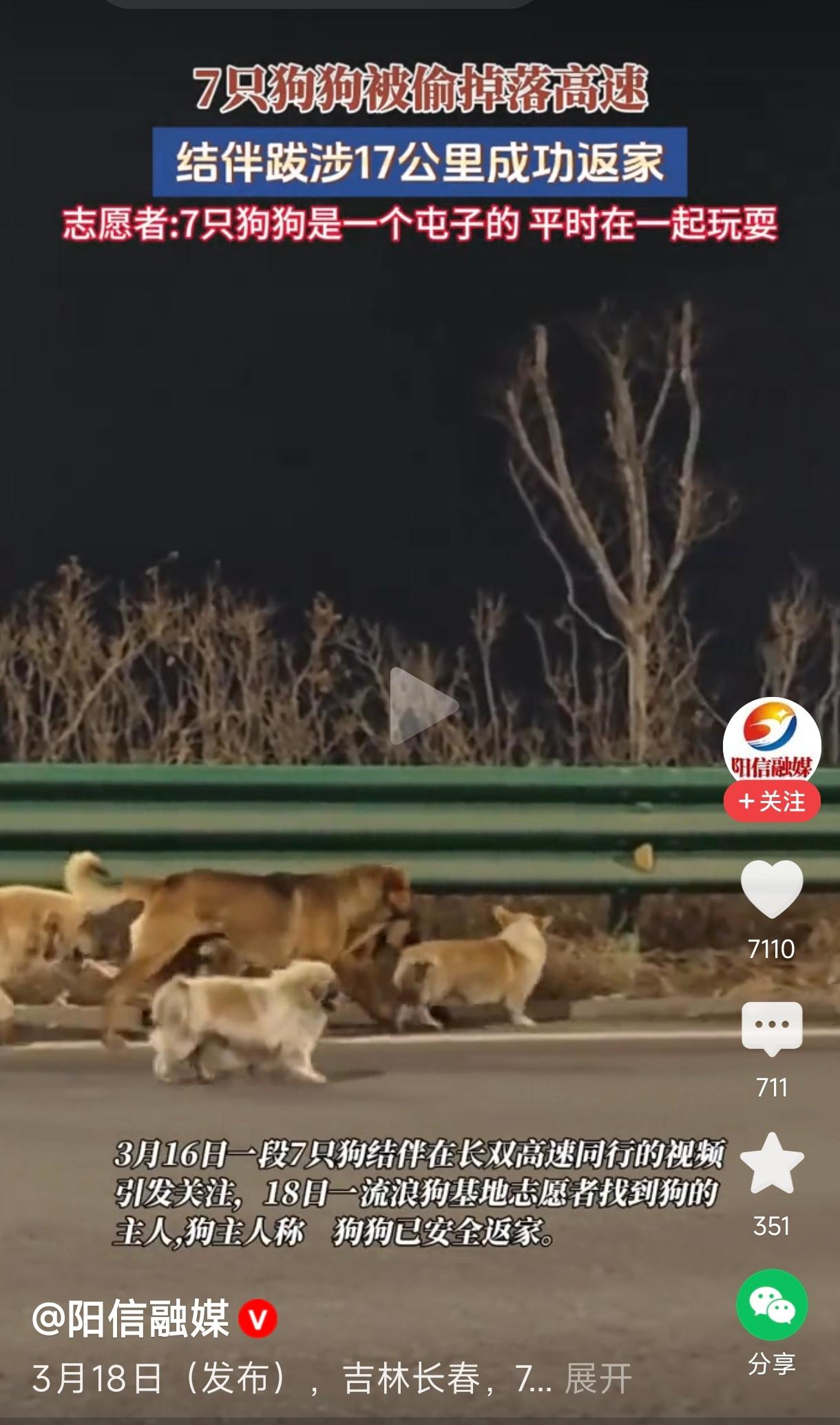 7只狗狗被偷掉落高速 跋涉17公里返家 这真是一个温暖人心的故事!7只狗狗被偷后掉落高速公路,却凭借彼此的陪伴和坚强的意志,结伴跋涉17公里成功返家,展现了动物之间深厚的情感和强大的生存能力。志愿者提到,这7只狗狗是一个“屯子”的,平时一起玩耍,彼此关系非常亲密。这样的故事不仅让人感受到动物的灵性,也提醒我们要更加关注和保护这些可爱的生命。感谢@苦咖啡流浪狗基地的救助和付出!动物的灵性 狗狗是生活的解药
