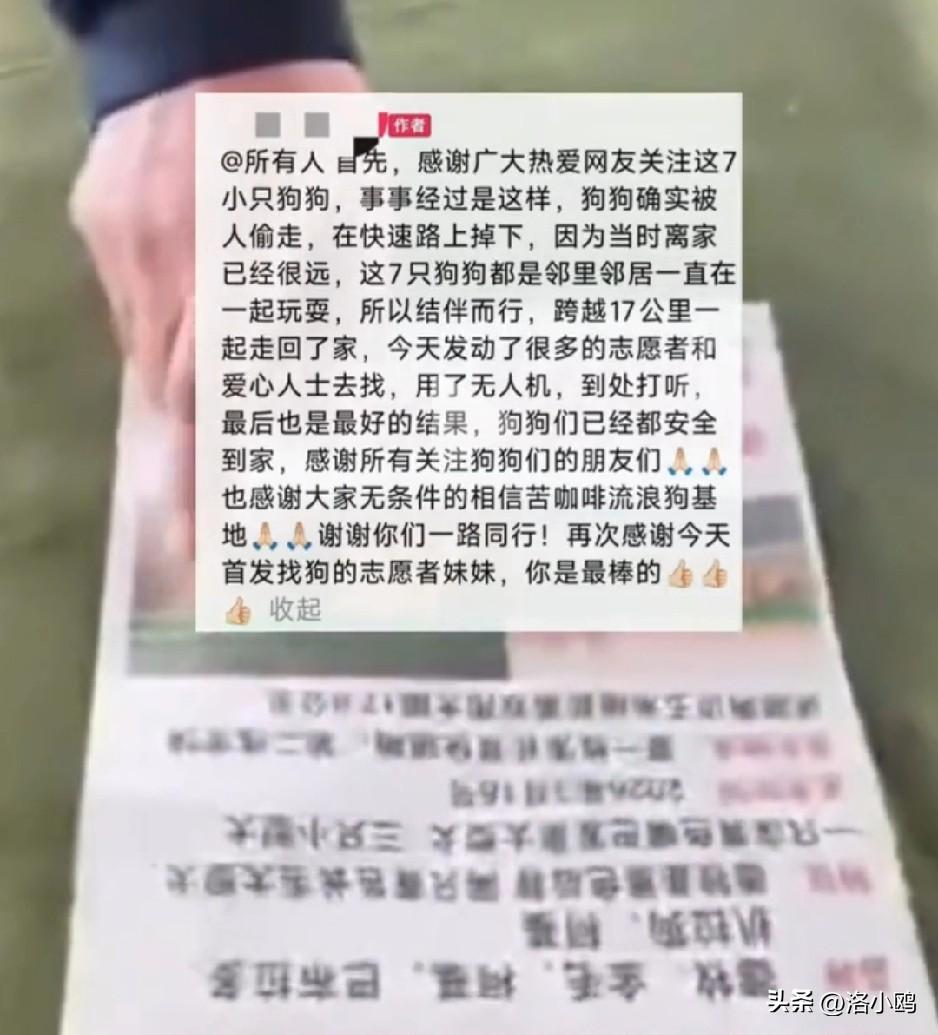 真是狗届奇迹啊! 7只狗狗被狗贩子偷走后,在高速路上逃脱,结伴而行17公里,安全到家。 这真的太励志了,志愿者、无人机都出动了,没想到高速路它们都认得回去的路。 这真不是段子,是真的,7只狗狗上演了惊心动魄的一部逃生电影《老狗囧途》啊。 我小时候家里穷,没米下锅,老爸把家里的狗拉到镇上去卖了,我跟着一起去,看着他被狗贩子拉走,我哭的很伤心。 没想到当我们回到家门口的时候,却看到它摇着尾巴在等着我们回来,可把我开心坏了。 不知道它是怎么逃脱的,既然回来了就是猿粪,反正最终我给它养老了。 这7只狗狗,有宠物狗,也有邻居家的阿黄,看图片是金毛当老大带路,真不错啊。