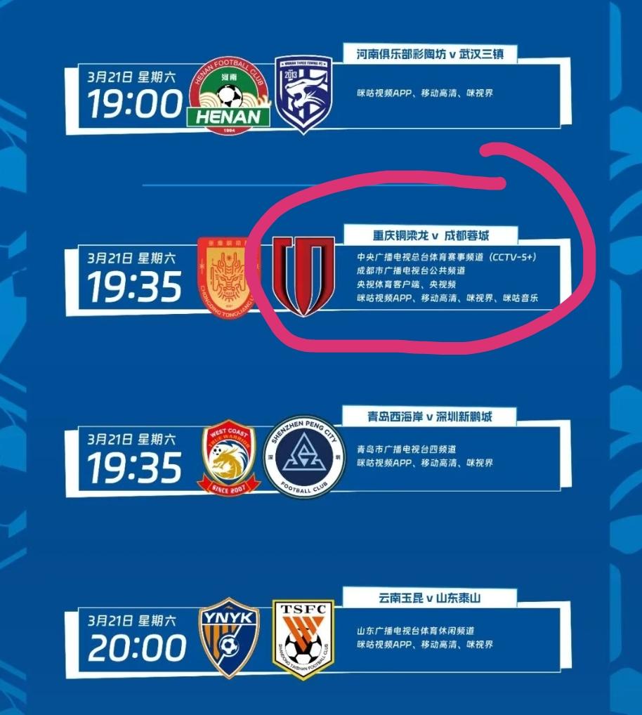 中超第三轮8场比赛的转播计划出炉,其中有两场比赛堪称本轮联赛最受关注的比赛,一场是国安主场踢申花的京沪大战,这场比赛会在CCTV-16播出,而另一场备受关注的比赛川渝德比-重庆铜梁龙主场踢成都蓉城的比赛将会在央视5+播出,其他的比赛也会在各自的地方台播出,想看球的球迷可以关注一下自己喜欢的球队的比赛播出时间,本轮联赛周五会有2场比赛,周六会有6场比赛,其中本轮联赛最早进行的比赛是大连英博主场踢上海海港,最晚进行的比赛是云南玉昆主场踢山东泰山!
