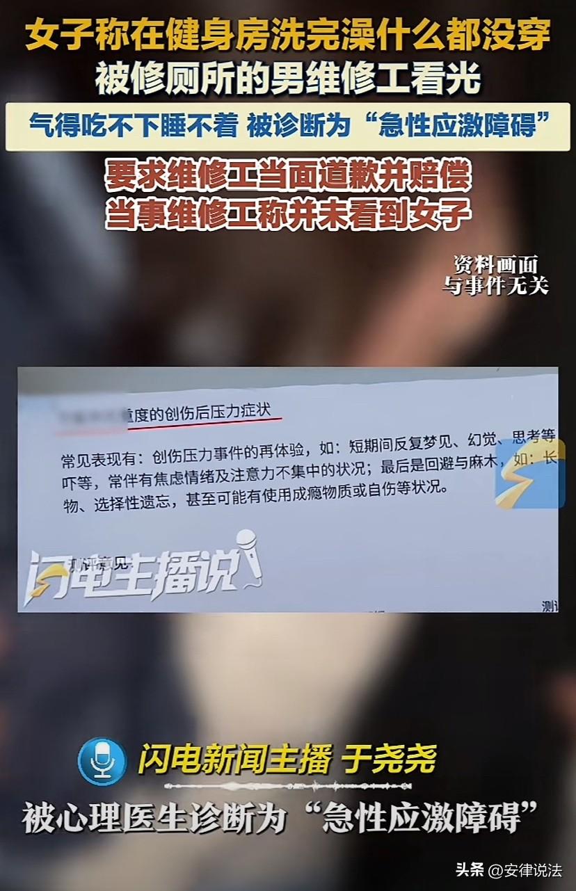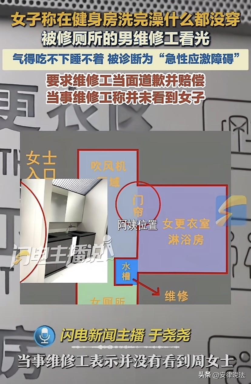 浙江嘉兴,女子在健身房洗完澡,而后一丝不挂从更衣室出来,准备去厕所,结果恰巧碰见一名男维修。与对方四目相对后,女子顿时羞耻不已,连忙用手遮挡自己的隐私部位,当天晚上,回家后,一回想起自己的遭遇,整个人都不好了,次日一早便前往健身房,决定让健身房给自己一个说法,让维修工给自己道歉,并给予自己一定的赔偿。不过,健身房仅仅只愿意退卡或者帮女子延长3个月的会员,双方闹得不欢而散。随后,女子更是气的吃不下饭,睡不着觉,又被诊断患了急性应激障碍。随后再次向健身房讨说法,怎料,健身房的说法,让女子彻底蒙圈! 据悉,3月5号晚上,周女士跟往常一样在一健身房健身。 8点许,健身完一身汗的周女士,便去健身房更衣室的洗澡间冲了个澡。 周女士冲完澡后,准备去卫生间上个厕所,再回来穿衣服。 哪曾想,刚走出更衣室没几步,就看到一名身穿黑色上衣、浅色裤子的陌生男子。 因为一丝不挂,与对方四目相对后,周女士顿时羞耻不已,连忙用手遮挡自己的隐私部位。 事后,周女士才知道这名陌生男子是维修工,原来是当晚女卫生间的管道坏了。 虽然如此,当天晚上周女士回到家后,一想起自己的遭遇,整个人都不好了。 次日一早,便前往健身房,决定为自己讨个说法。 周女士的想法是,让维修工给自己道歉,并赔偿自己一些损失就行了。 然而,好说歹说,健身房仅仅只愿意全额退还周女士1980元的办卡费或者帮周女士延长3个月的会员。 因双方谁也不愿意接受对方的方案,最终闹得不欢而散。 而在那之后,周女士就天天吃不下饭,睡不着觉,一闭眼就是当晚的画面,整个人精神状态差到极点。 最终实在扛不住去了医院一查,被诊断为急性应激障碍。 周女士随后拿着自己的诊断凭证又与健身房多次进行理论,未果后便将此事曝光给记者,希望记者帮自己讨个说法。 然而,记者联系到涉事健身房,涉事健身房的工作人员却给出了与周女士不一样的说法。 称,事发时只有保洁阿姨在场。保洁阿姨说,当时一直看着维修师傅,是师傅走了之后,周女士才从更衣室出来的。涉事维修工也说自己没看到周女士。 对此,网友纷纷表态,有网友表示,有没有看到先不说,健身房让维修工去维修女厕所,即便是保洁阿姨看着,怎么能保证没有女顾客从更衣室出来去上厕所。起码要通知一下女顾客,确实欠妥。 也有网友表示,这也不能全赖健身房,更衣室和卫生间是两个不同的区域,女子就不该不穿衣服去上厕所。 那从法律上该如何看待此事呢? 其实健身房的女更衣室和女卫生间都在同一女性专属区域,即便女子没穿衣服去上厕所也没有什么不妥。 《民法典》第1198条规定,宾馆、商场、银行、车站、机场、体育场馆、娱乐场所等经营场所、公共场所的经营者、管理者或者群众性活动的组织者,未尽到安全保障义务,造成他人损害的,应当承担侵权责任。 健身房应当预料到让男维修工维修厕所,可能会侵犯女顾客的隐私,但是却没有提前通知女顾客回避,如果侵犯了女顾客的隐私,就需要承担责任,包括不限于赔礼道歉、赔偿损失等等。 应当注意的是,《民法典》第1191条规定,用人单位的工作人员因执行工作任务造成他人损害的,由用人单位承担侵权责任。用人单位承担侵权责任后,可以向有故意或者重大过失的工作人员追偿。 劳务派遣期间,被派遣的工作人员因执行工作任务造成他人损害的,由接受劳务派遣的用工单位承担侵权责任;劳务派遣单位有过错的,承担相应的责任。 也就是说,发生这样的事情,该承担责任的不是维修工,而是作为用工单位的健身房。 周女士要求承担责任的主体应该是健身房,而不是维修工。 还应当注意的是,最高院《关于适用〈中华人民共和国民事诉讼法〉的解释》第90条规定:当事人对自己提出的诉讼请求所依据的事实或者反驳对方诉讼请求所依据的事实,应当提供证据加以证明,但法律另有规定的除外。在作出判决前,当事人未能提供证据或者证据不足以证明其事实主张的,由负有举证证明责任的当事人承担不利的后果。 像周女士这样,与健身房就自己是否被看到的事情各持一词的情况下,周女士想要成功维权,就必须拿出相应的证据。 因而,也借周女士的案件,再次提醒广大朋友们,平时一定要养成证据意识,学会用拍照、录像,甚至报警等等方式固定证据,避免因没有证据,最终吃哑巴亏! 这事您怎么看?欢迎在评论区留言,与大家一起交流您的看法! ------ 关注@安律说法 案例中看人生百态,法律中寻破局之法!