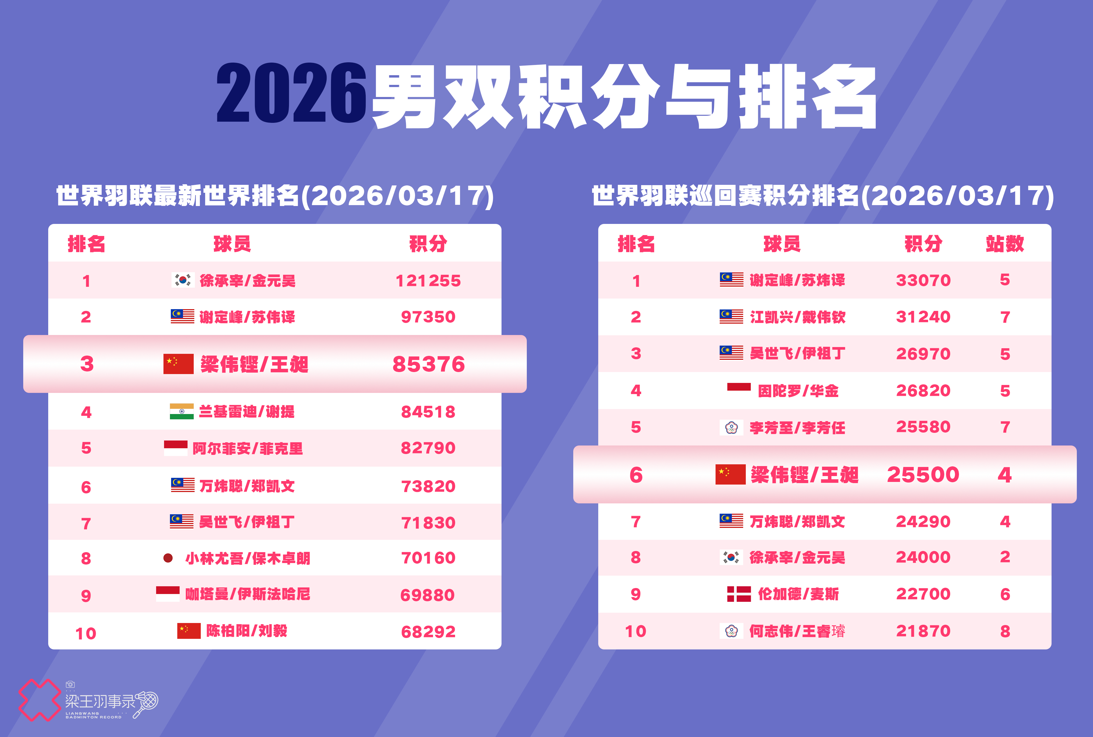 梁王驾到梁王组合 梁王加油 排名及积分更新(2026/03/17)BWF最新世界