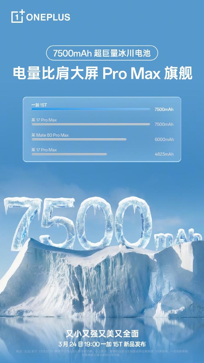 【一加15T搭载7500mAh超巨量冰川电池 】一加15T将于3月24日19:0