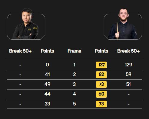 斯诺克世界公开赛最新战报! 吴宜泽5-2战胜威尔逊,周跃龙0-5被淘汰! 北京时间3月19日,斯诺克世界公开赛,第四比赛日16进8的角逐。 ①奥利沙文5-3墨菲。 奥利沙文状态调动不错,首局凭借出色的手感96-0先拔头筹。墨菲不甘示弱,单杆直接破百,轰出139-0还以颜色,命中率很高。两人的较量势均力敌,呈现交替领先,随后各赢一局,半场战成2-2平手。重新回到比赛双方持续拉锯,火箭后程发挥更胜一筹,越打越稳,没有出现明显失误,最终5比3成功晋级。 ②吴宜泽5-2凯伦·威尔逊。 威尔逊率先发力,首局准度相当可观,单杆轻松破百112-0占先机,接着74-33扩大优势。吴宜泽并未受到影响,获得上手机会打得非常沉稳,并且是持续提升状态,手感渐入佳境,从0-2连赢五局,5-2逆转过关,最后一局尤其自信,左右开弓真是太准。 ③周跃龙0-5马克·艾伦。 第一局进展非常流畅,艾伦单杆破百轰出129-0旗开得胜。比赛第二局则急转直下,两人轮番防守寻找接球策略,长时间的缠斗,周跃龙未能抓住机会41-82落败,此后调整也格外一般,每次看到希望却无法把握,惨遭五连鞭,0-5完败无缘晋级下一轮。