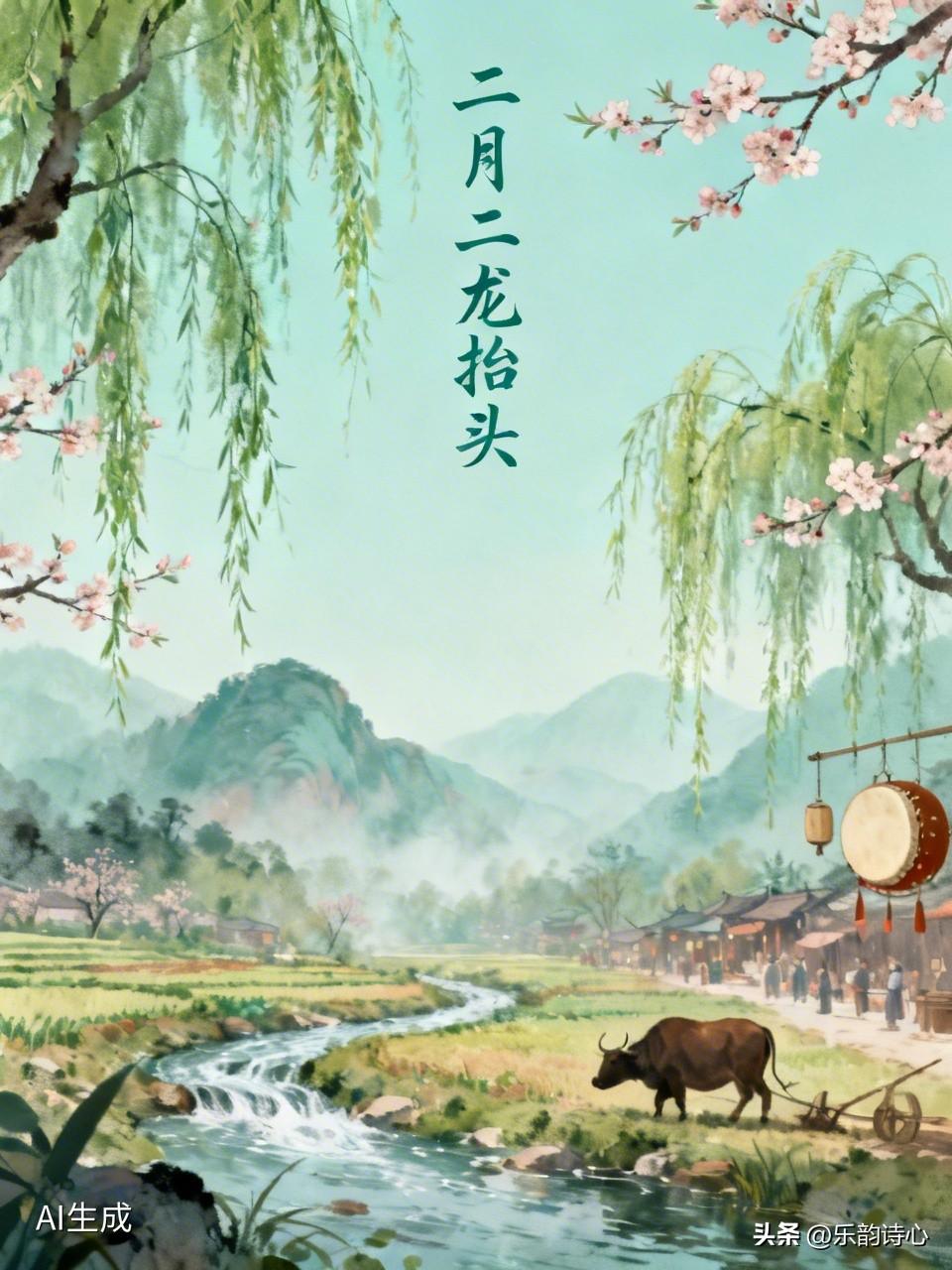 《二月二龙抬头》乐韵诗心原创诗词: 东风送暖入神州, 二月龙醒破寂幽。 岸柳摇丝添秀色, 山桃绽蕊映清流。 田畴祈愿耕牛奋, 市井迎祥社鼓稠。 且待甘霖滋万物, 丰年盛景醉心头。 首联点明时节,东风带来温暖,二月二龙从沉睡中苏醒,打破冬日的寂静幽冷,开启生机。颔联描绘自然景色,柳丝摇曳、山桃绽放,与清澈水流相互映衬,尽显春日秀丽。颈联转向人间活动,田野里人们祈愿,耕牛奋蹄准备劳作;市井中社鼓喧闹,迎接祥瑞。尾联表达期待,盼望甘霖滋润万物,迎来丰收盛景,会人陶醉。