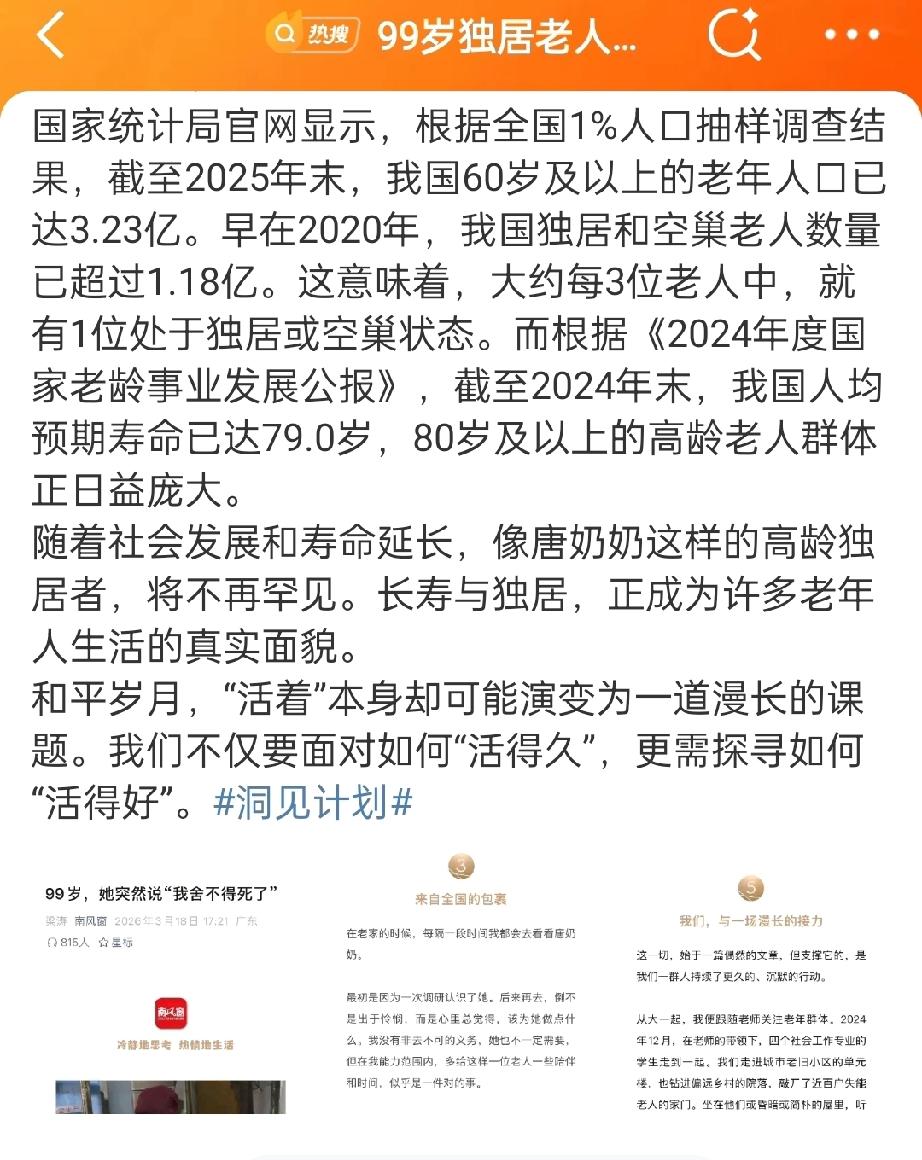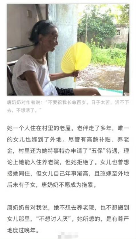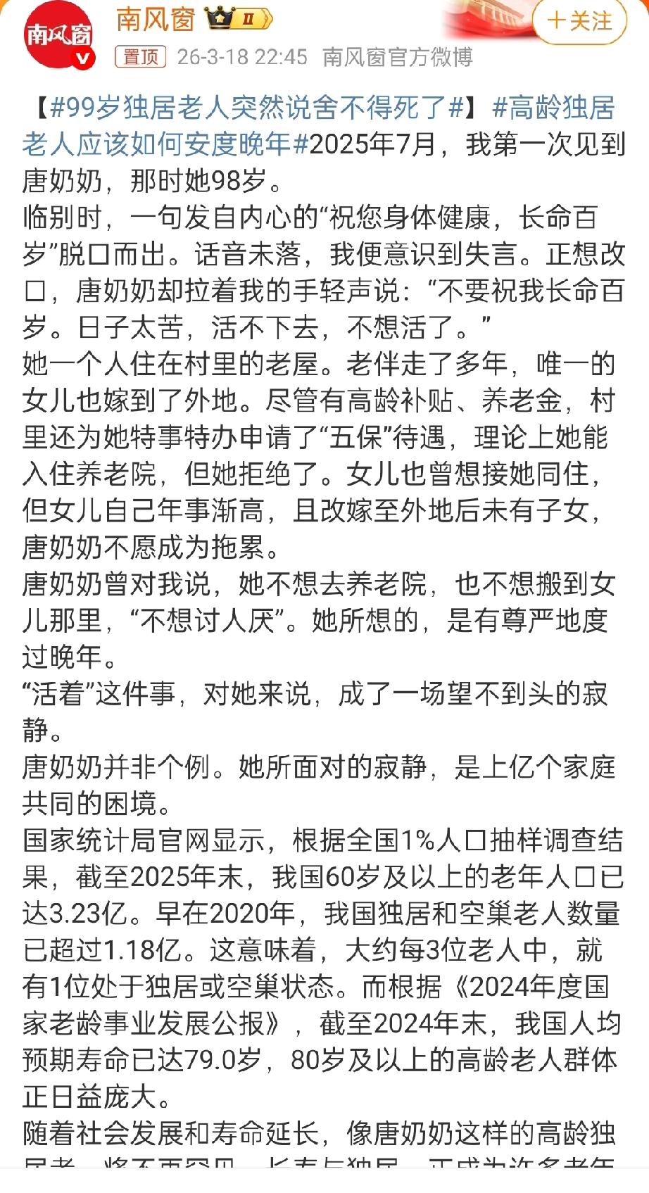 99岁独居老人突然说舍不得死了。“不要祝我长命百岁,日子太苦,活不下去,不想活了。”看了案例,内心复杂,孤独的长寿不是福气,而是一种折磨…假如老人和女儿各有孩子在身边,相比也不必如此孤寂: “过不过年对我来说都一样的,老伴走了多年,唯一女儿嫁到了外地。尽管有高龄补贴、养老金,村里还为她特事特办申请了“五保”待遇…女儿也曾想接她同住,但女儿自己年事渐高,且改嫁至外地后未有女,唐奶奶不愿成为拖累…“活着”这件事,对她来说,成了一场望不到头的寂静…” 所以我还是建议各位,能生育、想生育的尽早生育,不想生育的多问问自己,有足够强大的内心扛得住未来的孤独吗?长寿忠告 临终人生感悟 退休独居老人