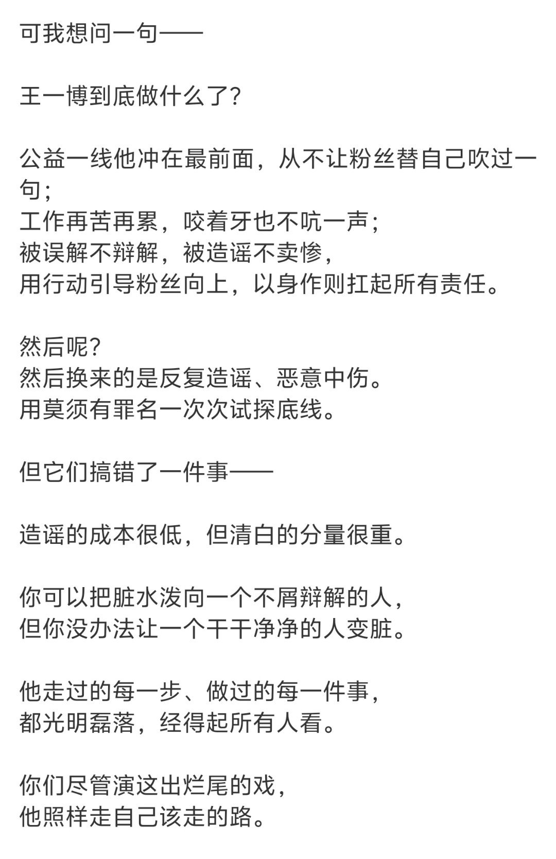 王一博方曾多次辟谣私生爆料 路人不是傻子,谁在发光,一目了然。恶意P图终成灰, 竹篮打水总枉然摩托大军今犹在,笑看星辰越九天王一博