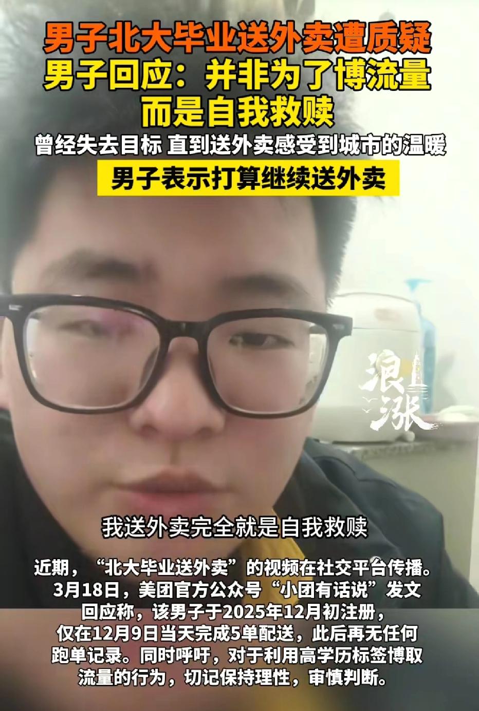 北京大学社会学专业毕业的陶某送外卖,平台调查他只是在2025年12月送了5单就再也没送过。此事件引起轩然大波。 其实深扒他的简历,陶某确实是北京大学毕业,2021年安庆的高考文科状元,高考考了660分。2025年毕业后,工作不顺利,一段时间在老家呆着,从事初高中辅导。 短暂还在教培机构当过老师,以自己“倒数第二逆袭北京大学”的经历作为噱头,给孩子们讲课。其实学社会学专业,口才表达又好,状元身份,这应该走上正确的道路。 后来不知道什么原因,开始短暂送外卖,又开始以北大加外卖员身份做自媒体,也许看到自媒体的成果比较大吧,最后成为焦点。 整个事件看上去,确实非常不解,能高考普招考上北京大学的学生,智商肯定不低,如果不擅长人际关系和社交,最起码能考公吧?这也是非常不错的选择。目前看来,陶某完全没方向。 网络上的饭,不是谁都能吃下的,陶某有学历优势,为什么不能做些内容性的东西,以以贩卖焦虑博流量确实不可取,有可能遭强烈反噬!