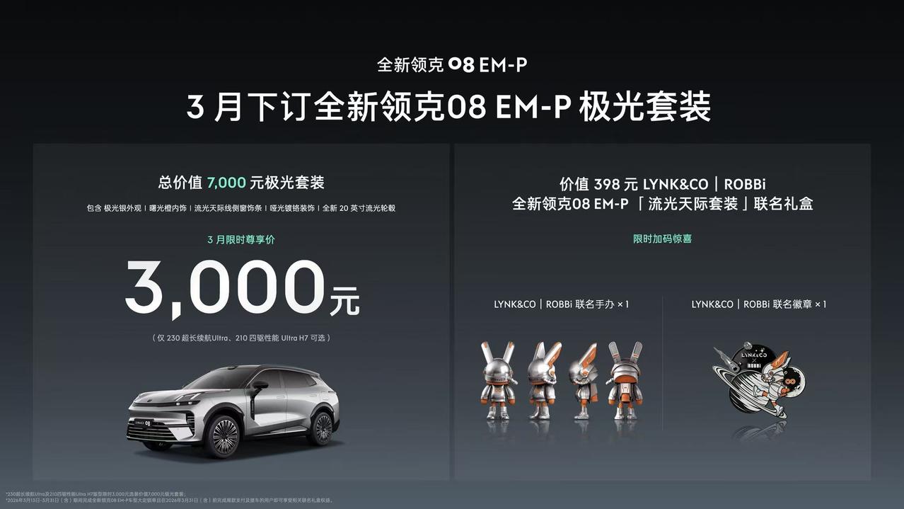 【限时15.98万元起,领克08 EM-P推出极光套装】3月19日,领克08 EM-P推出极光套装,3月限时专享价为15.98万元起。该套装采用极光银外观与曙光橙内饰撞色设计,搭配20英寸流光轮毂及哑光镀铬装饰。内饰采用Nappa真皮包裹并搭配Ansole抗污技术,配备至高四座同享加热通风按摩功能与哈曼卡顿23扬豪华音响。领克08 EM-P与潮流艺术IP ROBBi推出联名礼盒,官方宣布第二季度将为其推送LYNK Flyme Auto 2.2系统,解锁D2D车位到车位领航驾驶辅助功能。【来自懂车帝车友圈】