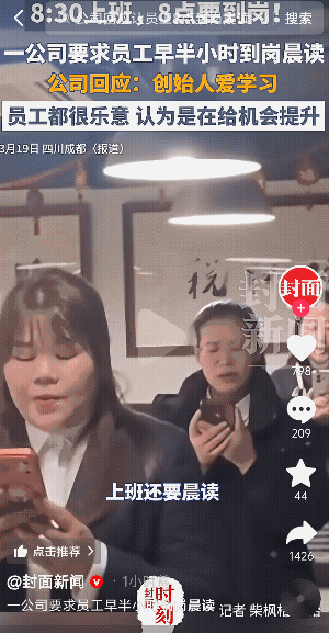 四川成都,一公司“8点半上班,员工被要求8点要到岗”原来是公司创始人爱学习,所以要求员工早半个小时到岗晨读。 近日,有网友反映,成都一家公司本来上班时间为8点半,但由于公司的创始人热爱学习,所以员工被要求要提前半个小时到岗晨读。 然而,本以为只是公司偶尔要求的,没想到公司工作人员回应,公司从开业到现在,就一直都有这个规定。而晨读的内容大多是管理和经营方面,主要是为了提升员工素质,与时俱进。 公司工作人员还表示:员工都很乐意,认为这是公司给机会提升自己。 而针对这一现象,有网友很是不赞同的,认为公司8点半上班,你创始人爱学习可以,时间可以提到8点半到9点,为何要员工提前半个小时到岗,占用员工时间。能多睡上半个小时都觉得幸福! 而对于这个,律师方面也是有话说的,表示,如果说公司方面坚持保留这个晨读的文化。是可以的,但是应当把时间调整到正式工作时间内,亦或者依法支付相应的加班费用。(大家不要拦着我,我要给律师点个赞!) 另外针对员工都乐意这个说辞,网友们更是都打上问号了! 其实从这个可以看出好些问题,都是有过牛马日子的,懂得都懂,是不是?打个比方,有些公司就特别喜欢在下班后,要去开会,都明明下班了,要开会为何不在下班时间提早半个小时?等等问题。这个是不是个社会现象,我们有没有可以选择呢? 只是觉得,我们打工人的时间不应该是免费的,不应该牺牲打工人的时间完成一些指标或者任务。哪怕打工人的时间不值钱,那也是我们的! 各位看官老爷们有什么想说的呢? 职场 打工人 公司 加班 如果不缺钱,你还会工作吗 信息来源:封面新闻