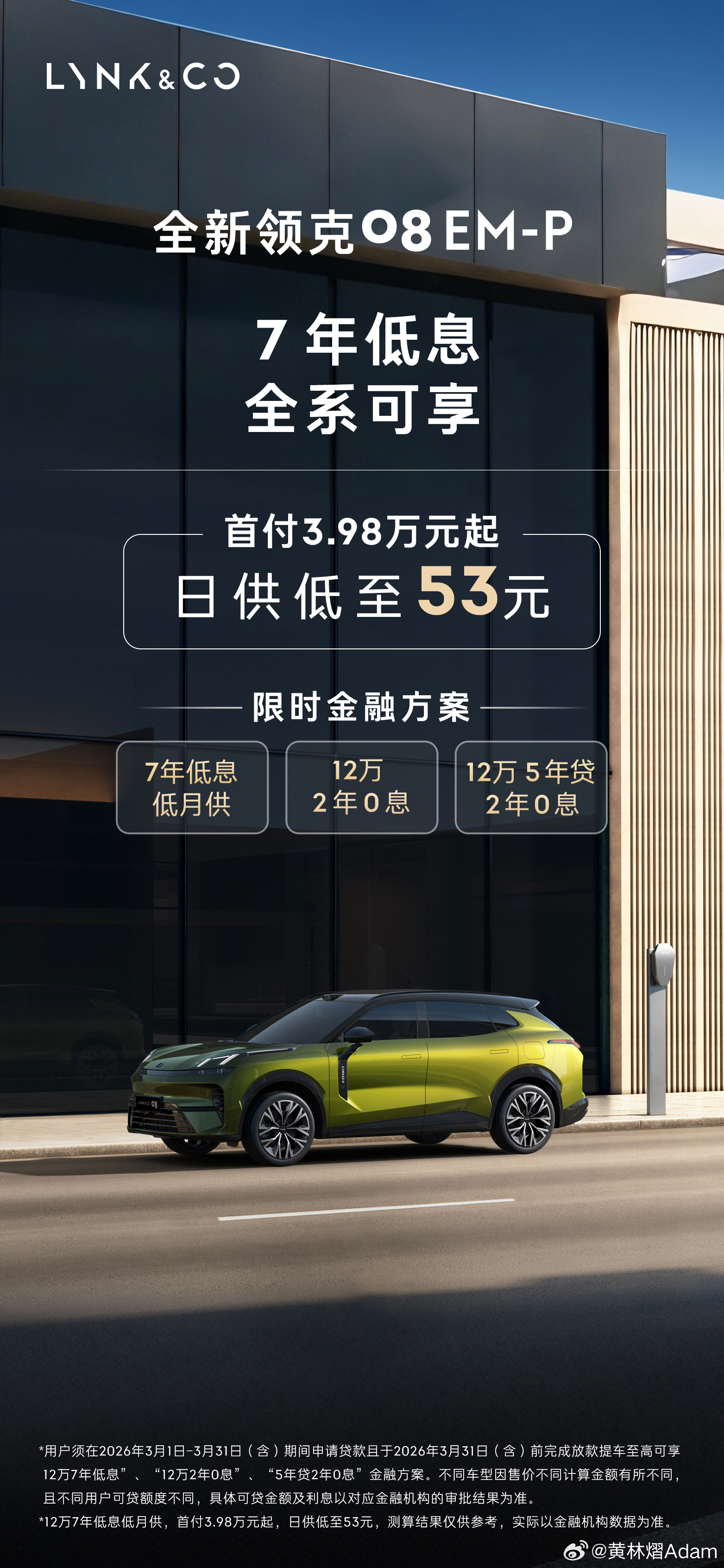 3. 领克最近推行了一个七年低息的购车政策,结合驾驶辅助的升级,我认为在当前价格下领克08 EM-P还是相当有竞争力的领克08极光套装灵感上新