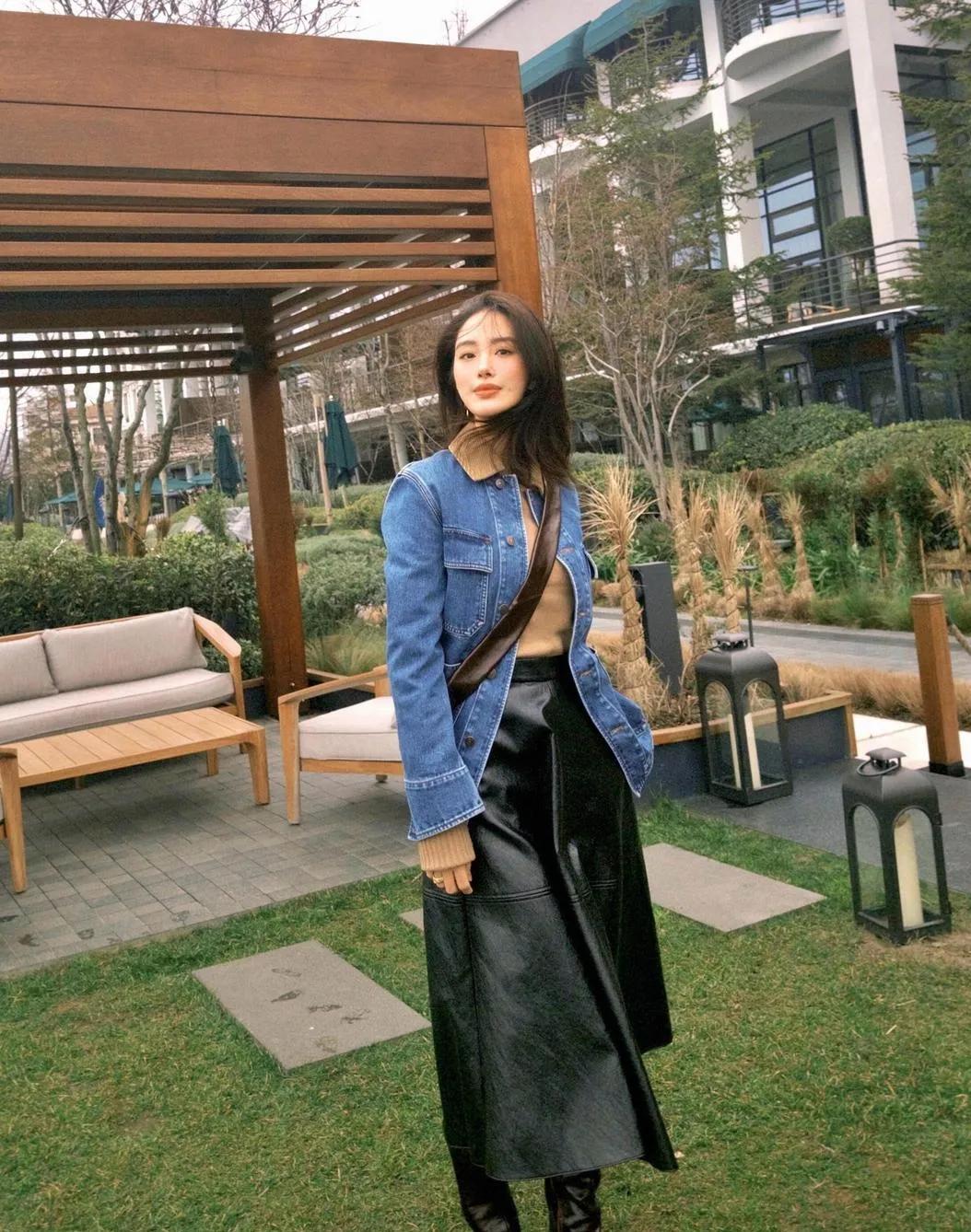 杨采钰这组街拍我能循环看!✨ 牛仔外套叠穿针织衫,再搭配皮裙,时髦又高级。 这种